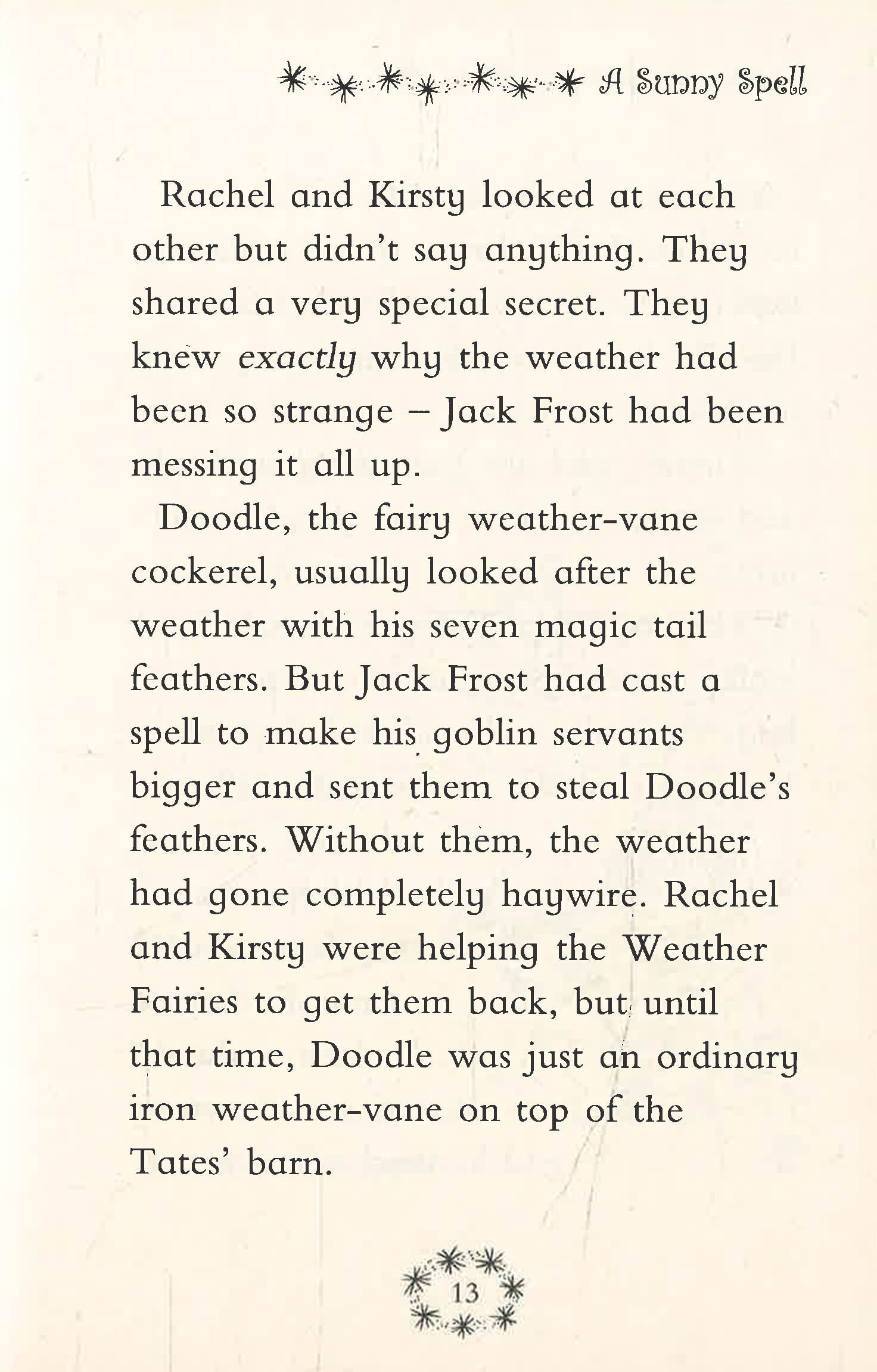 Jack Frost has promised not to trouble the Rainbow Fairies again, but he didn't say anything about the Weather Fairies! Now he has stolen the feathers from Doodle, the weather-vane cockerel in charge of the weather. It's up to Rachel and Kirsty to get each of the feathers back!