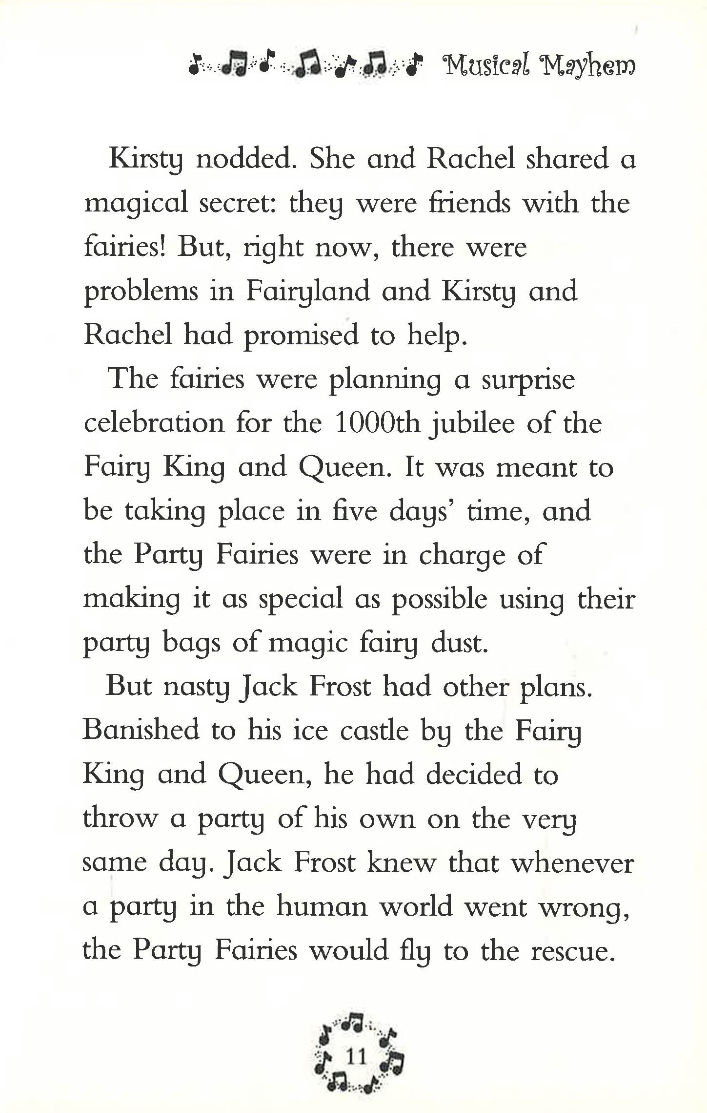 Get ready for an exciting fairy adventure with the no. 1 bestselling series for girls aged 5 and up. It's Queen Titania's and King Oberon's 1000th jubilee, and the seven Party Fairies are in charge of making the celebratory party extra-special! However, naughty Jack Frost has stolen each of the seven Party Fairies' magical party bags... if he succeeds the Fairyland celebrations will be ruined! Can Kirsty and Rachel help rescue the party bags so the magnificent jubilee cake can be finished in time...? 'These stories are magic; they turn children into readers!' ReadingZone.com Read all seven fairy adventures in the Party Fairies set! Cherry the Cake Fairy, Melodie the Music Fairy; Grace the Glitter Fairy; Honey the Sweet Fairy; Polly the Party Fun Fairy; Phoebe the Fashion Fairy; Jasmine the Present Fairy If you like Rainbow Magic, check out Daisy Meadows' other series: Magic Animal Friends and Unicorn Magic!