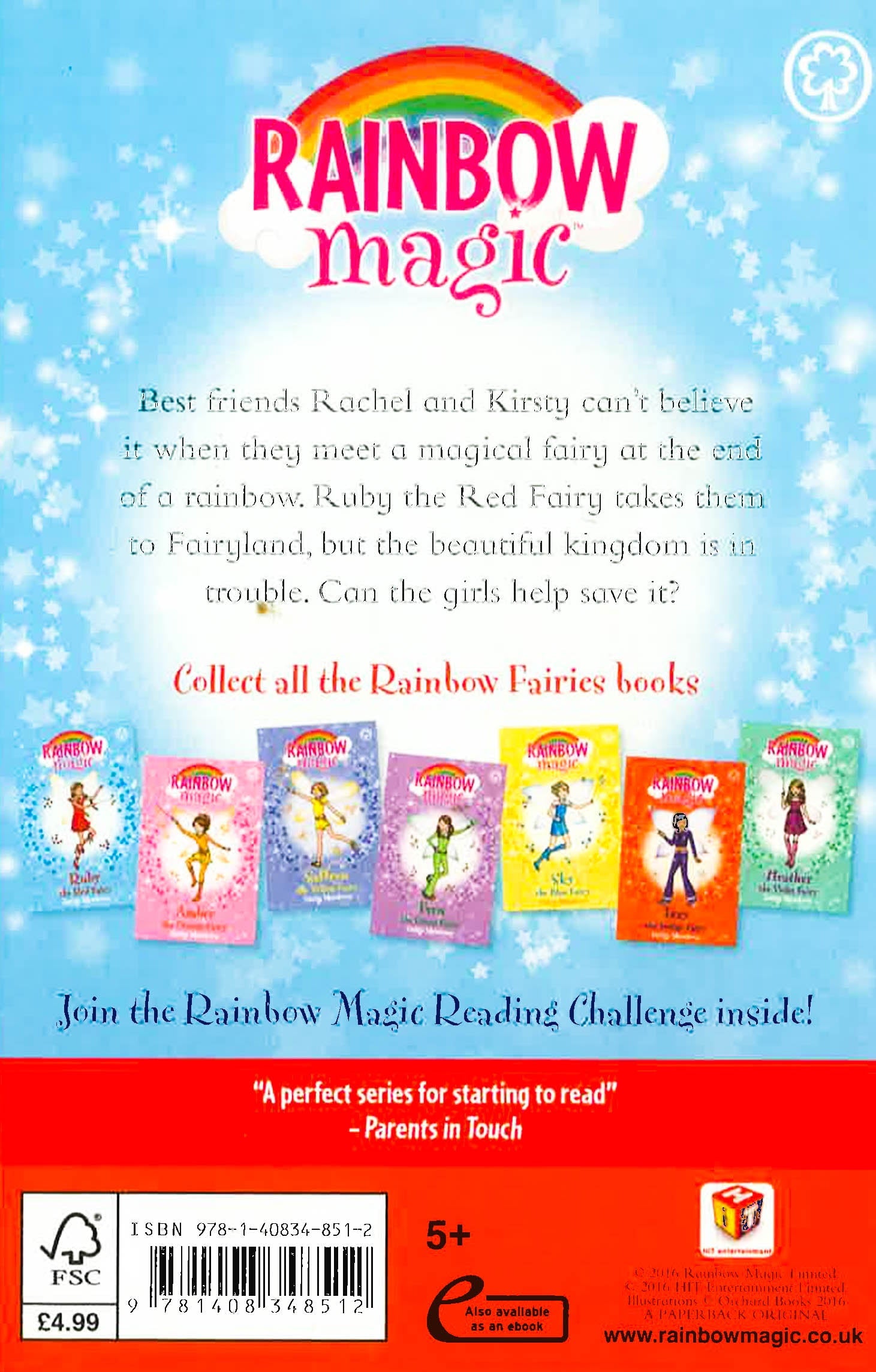 Best friends Rachel and Kirsty can't believe it when they meet a magical fairy at the end of a rainbow. Ruby the Red Fairy takes them to Fairyland, but the beautiful kingdom is in trouble. Can the girls help save it?