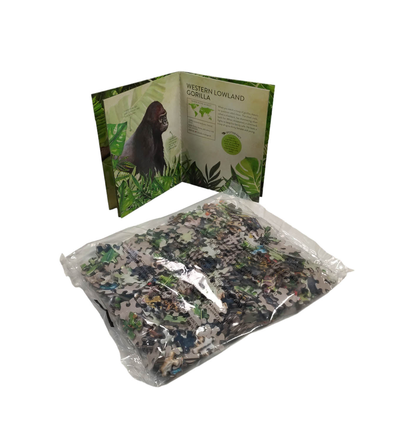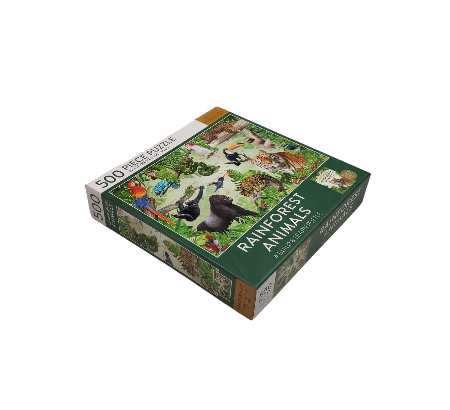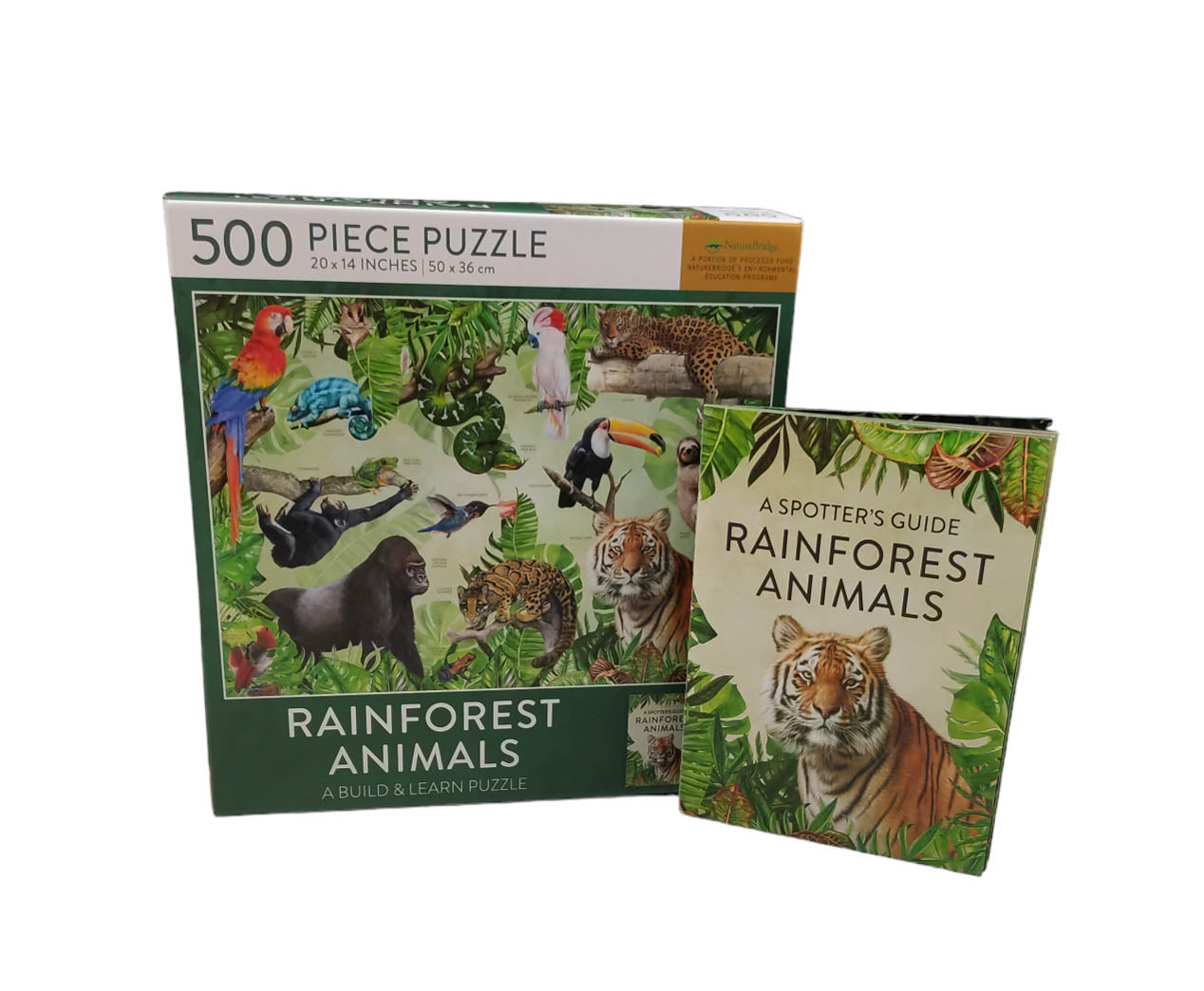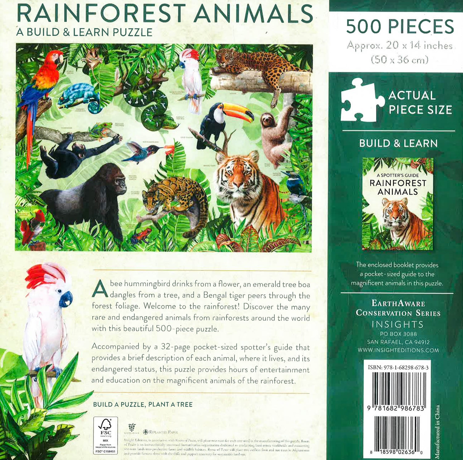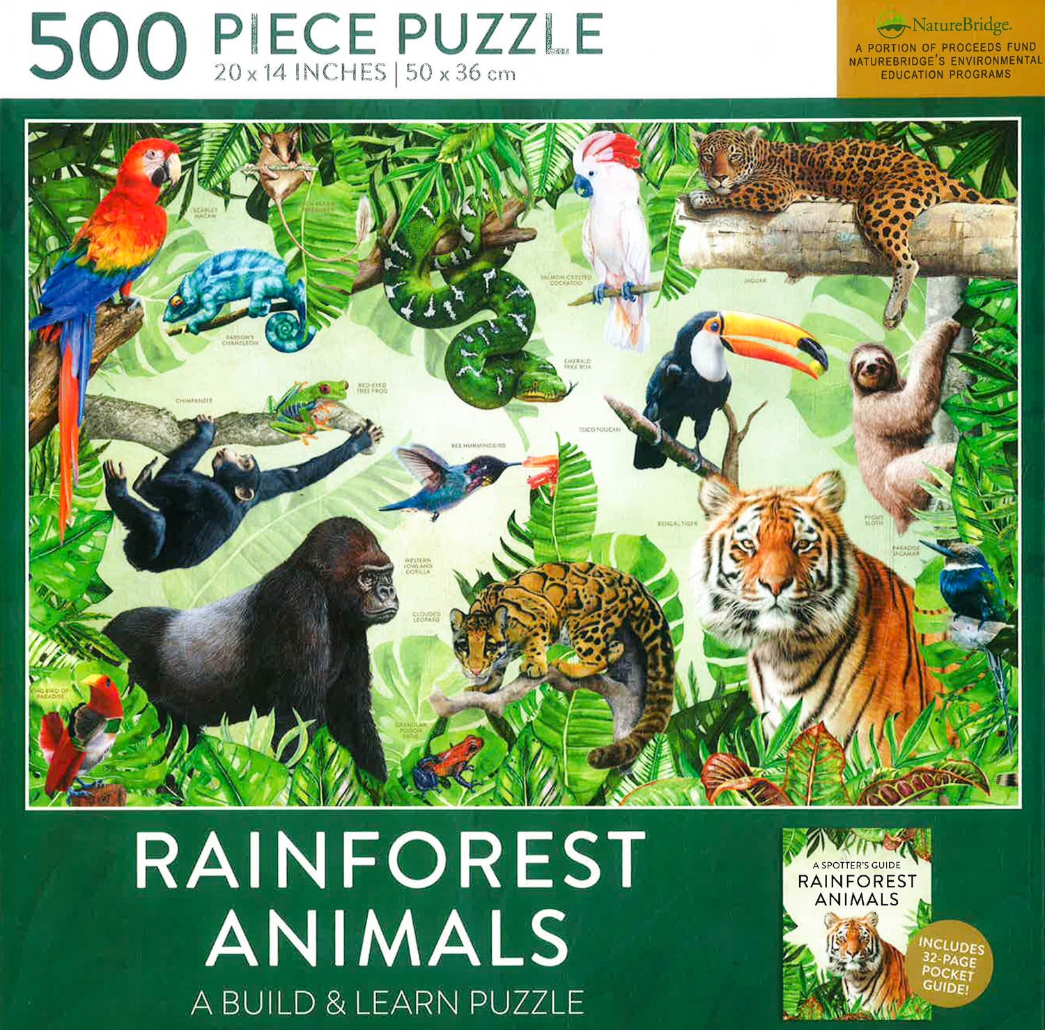 A Black Spider Monkey dangles from a tree, a Bee Hummingbird drinks from a flower, and a Bengal Tiger peers through the forest foliage. Welcome to the rain forest! Discover the many rare and endangered animals from rain forests around the world as you whittle away the hours with this beautiful 500-piece puzzle.