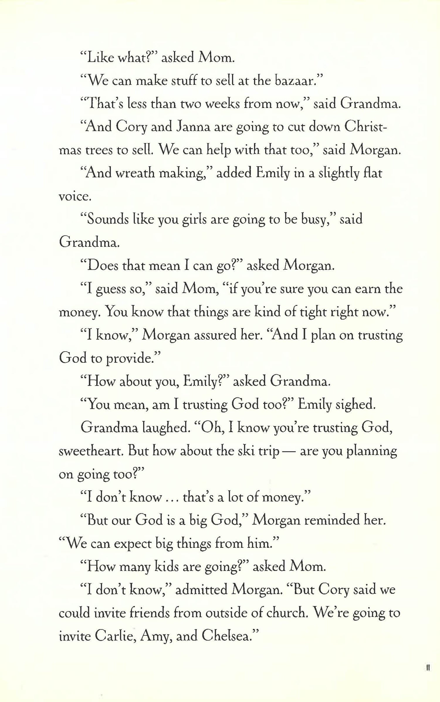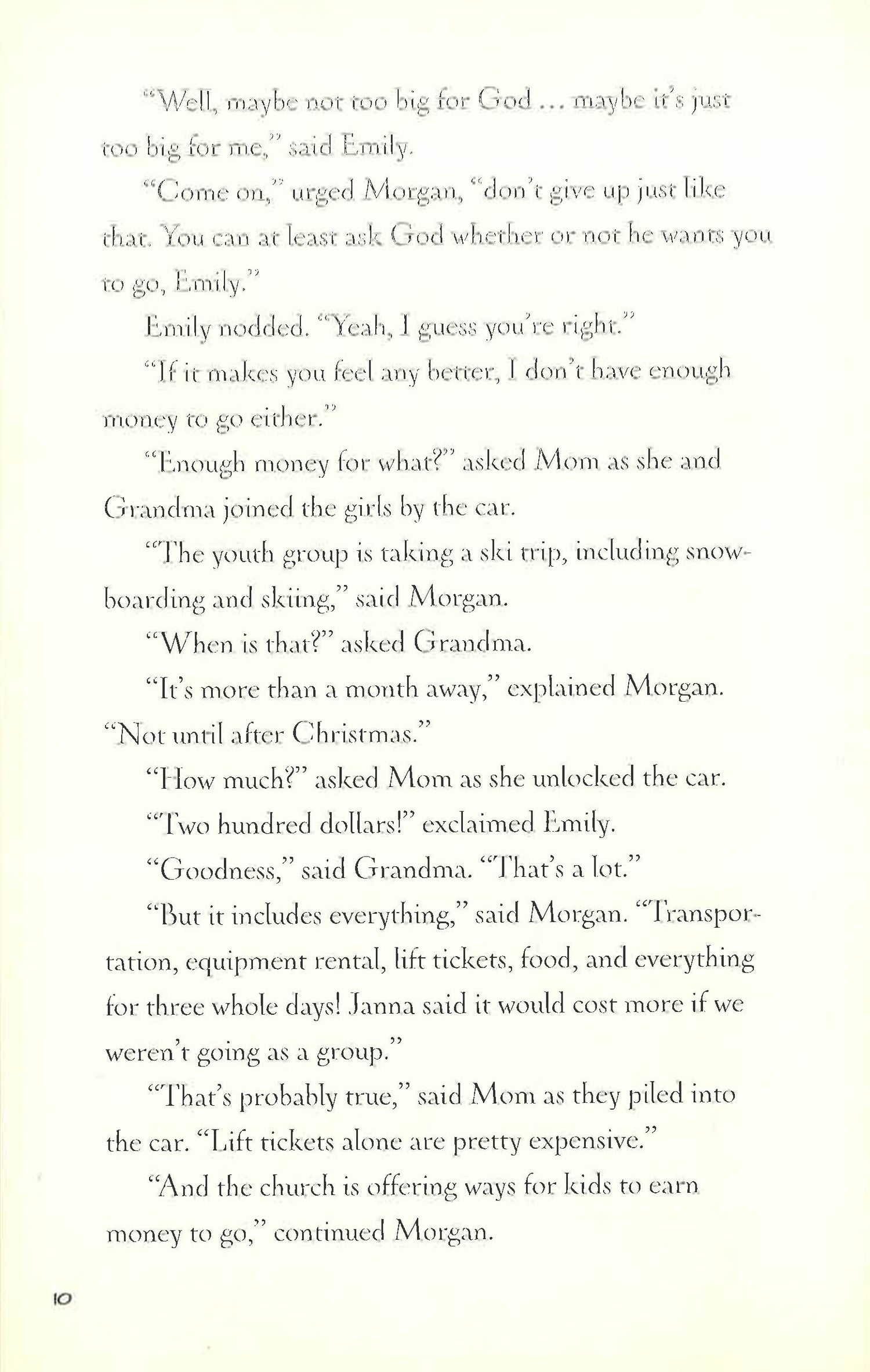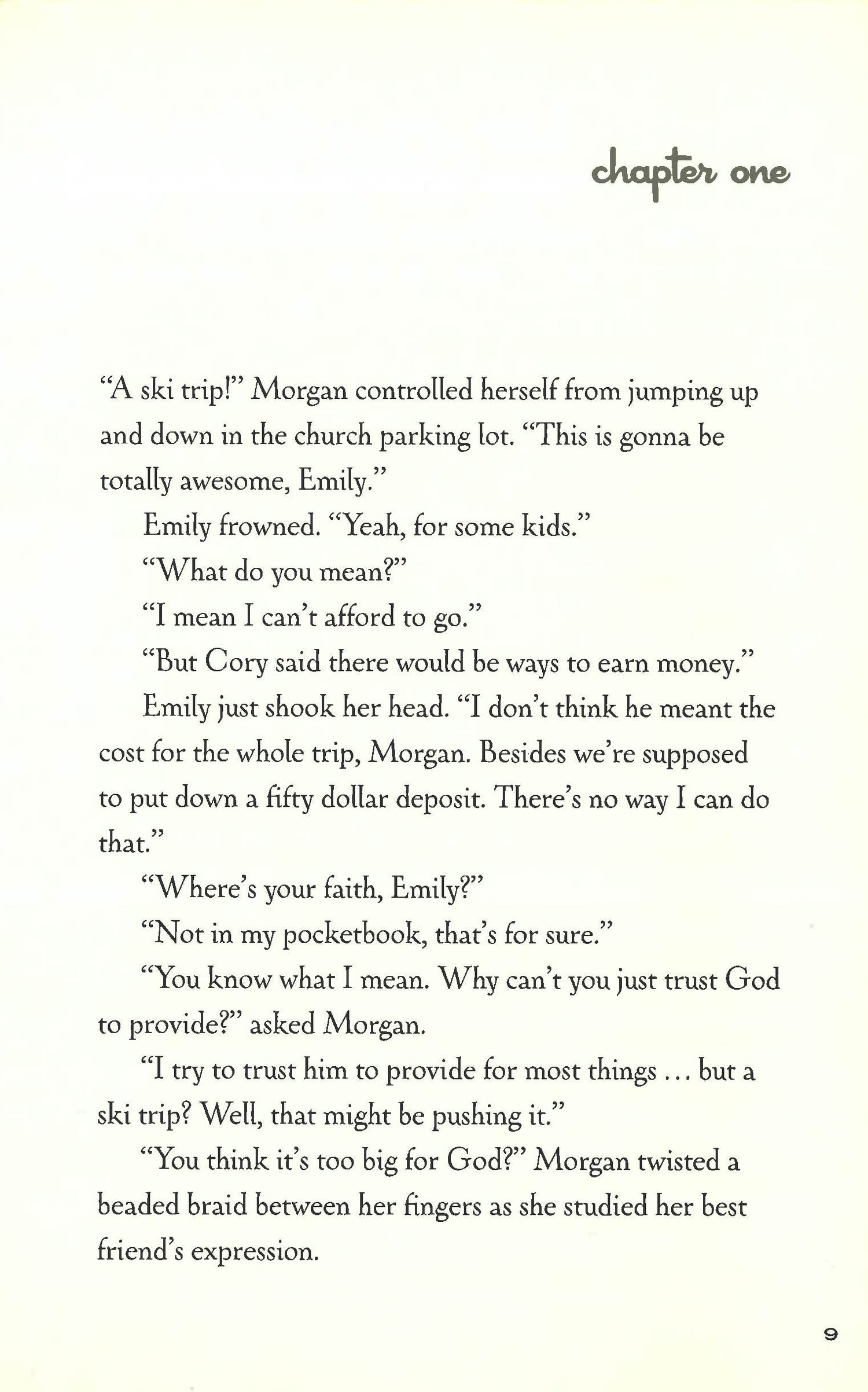 Raising Faith: Morgan trusts God to provide her with ski trip funds and works hard to earn the needed money. But when everything blocks her efforts, from her school activities to her grandmother's life-threatening heart attack, it's a test of faith against the odds.