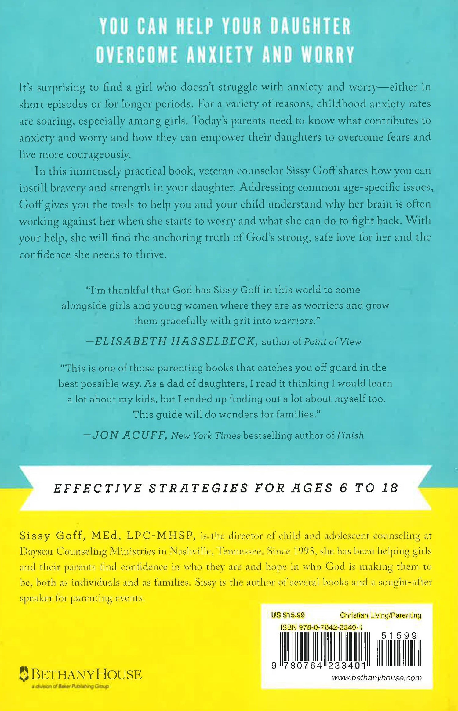 If you have a daughter, it would be surprising if she doesn't struggle with anxiety and worry--either in short episodes or for longer periods. For a variety of reasons, childhood anxiety rates are soaring, especially among girls. Today's parents need to know what contributes to anxiety and worry and how they can empower their daughters to overcome troubling emotions. In this immensely practical book, veteran counselor Sissy Goff shares how you can instill bravery and strength in your daughter. Addressing common age-specific issues, Goff gives you the tools to help you and your child understand why her brain is often working against her when she starts to worry, and what she can do to fight back. With your help, she will find the anchoring truth of God's strong, safe love for her and the confidence she needs to thrive.