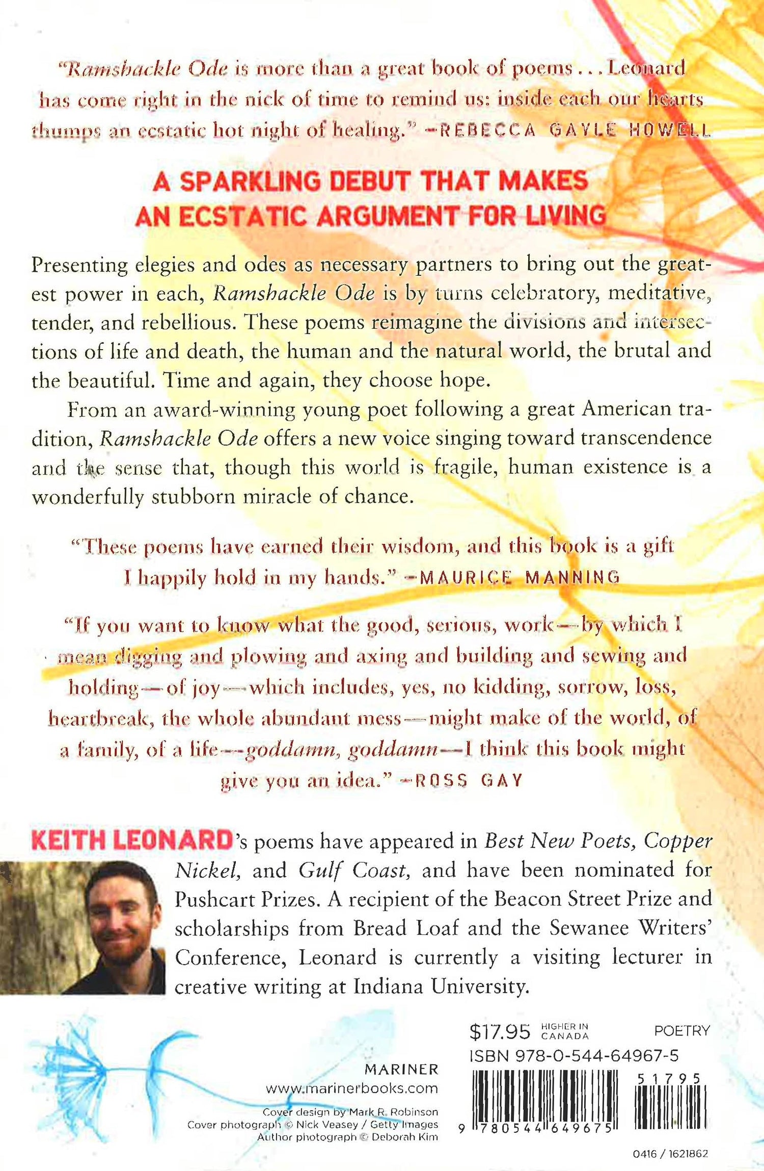 A sparkling debut collection from a Pushcart Prize-nominated poet that makes an ecstatic argument for living Containing joy and suffering side by side, Ramshackle Ode offers elegies and odes as necessary partners to bring out the greatest power in each. By turns celebratory, meditative, tender, and rebellious, these poems reimagine the divisions and intersections of life and death, the human and the natural world, the brutal and the beautiful. Time and again, they choose hope. From an award-winning young poet in the tradition of Marie Howe, Walt Whitman, Gerald Stern, and contemporary American bard Maurice Manning, Ramshackle Ode presents a new voice singing toward transcendence, offering the sense that, though this world is fragile, human existence is a wonderfully stubborn miracle of chance.
