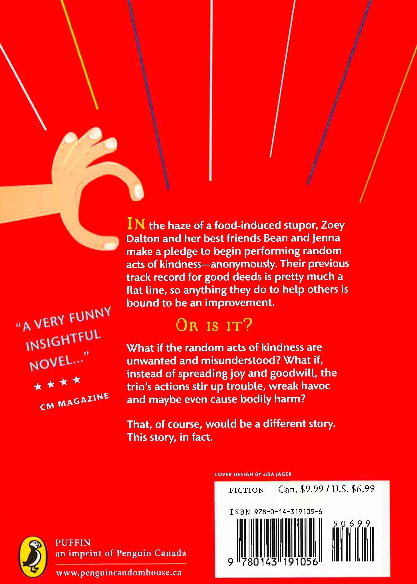 Now in paperback, a laugh-out-loud middle-grade novel featuring three friends whose acts of kindess go terribly awry. In the haze of a food-induced stupor, Zoey Dalton and her best friends Bean and Jenna make a pledge to begin performing random acts of kindness--anonymously. Their previous track record for altruism is pretty much a flat line, so anything they do to help others is bound to be an improvement. Or is it? What if the random acts of kindness are unwanted and misunderstood? What if, instead of spreading joy and good will, the trio's actions stir up trouble, wreak havoc and maybe even cause bodily harm? That, of course, would be a different story. This story, in fact. *This book may have remainder mark*
