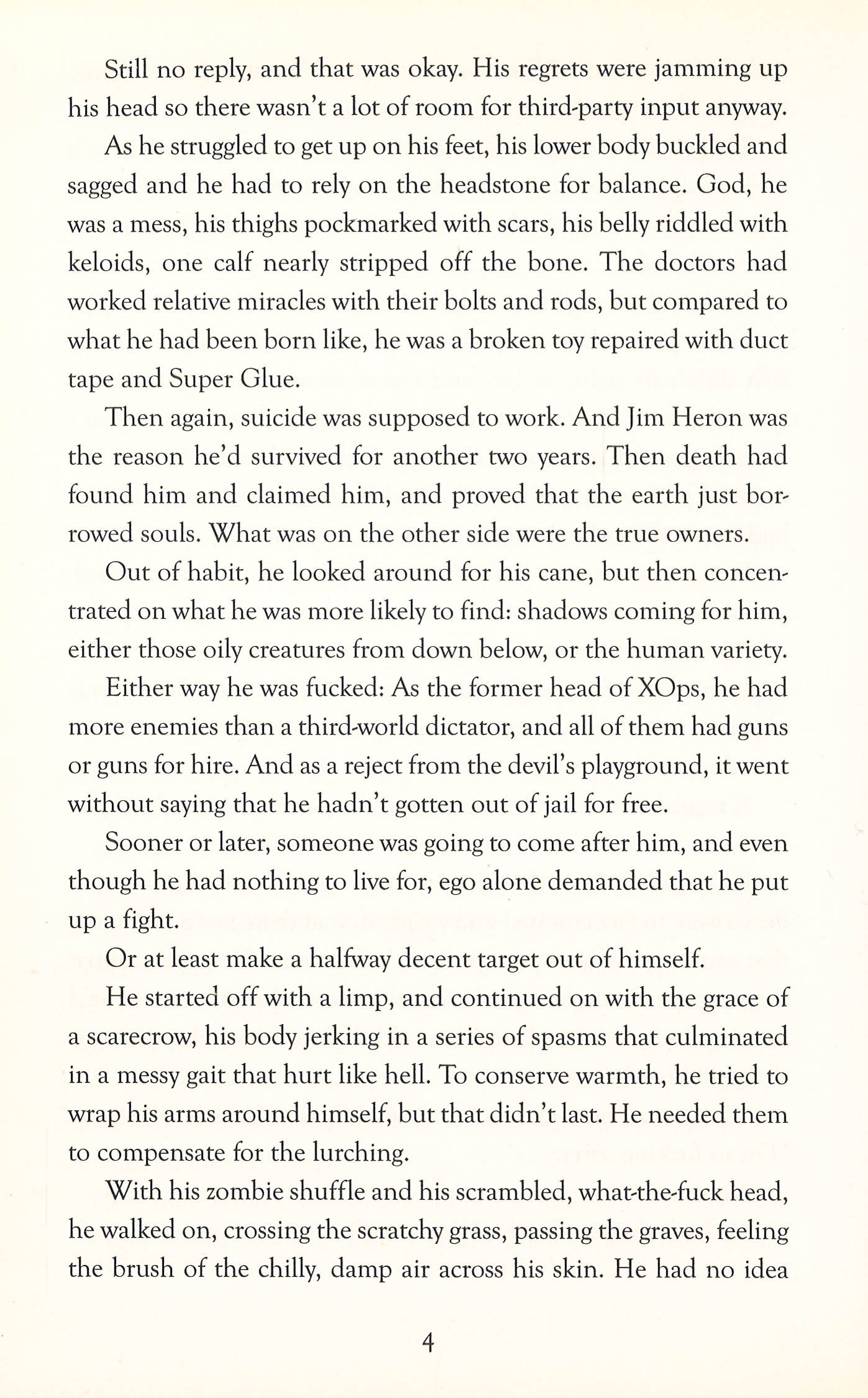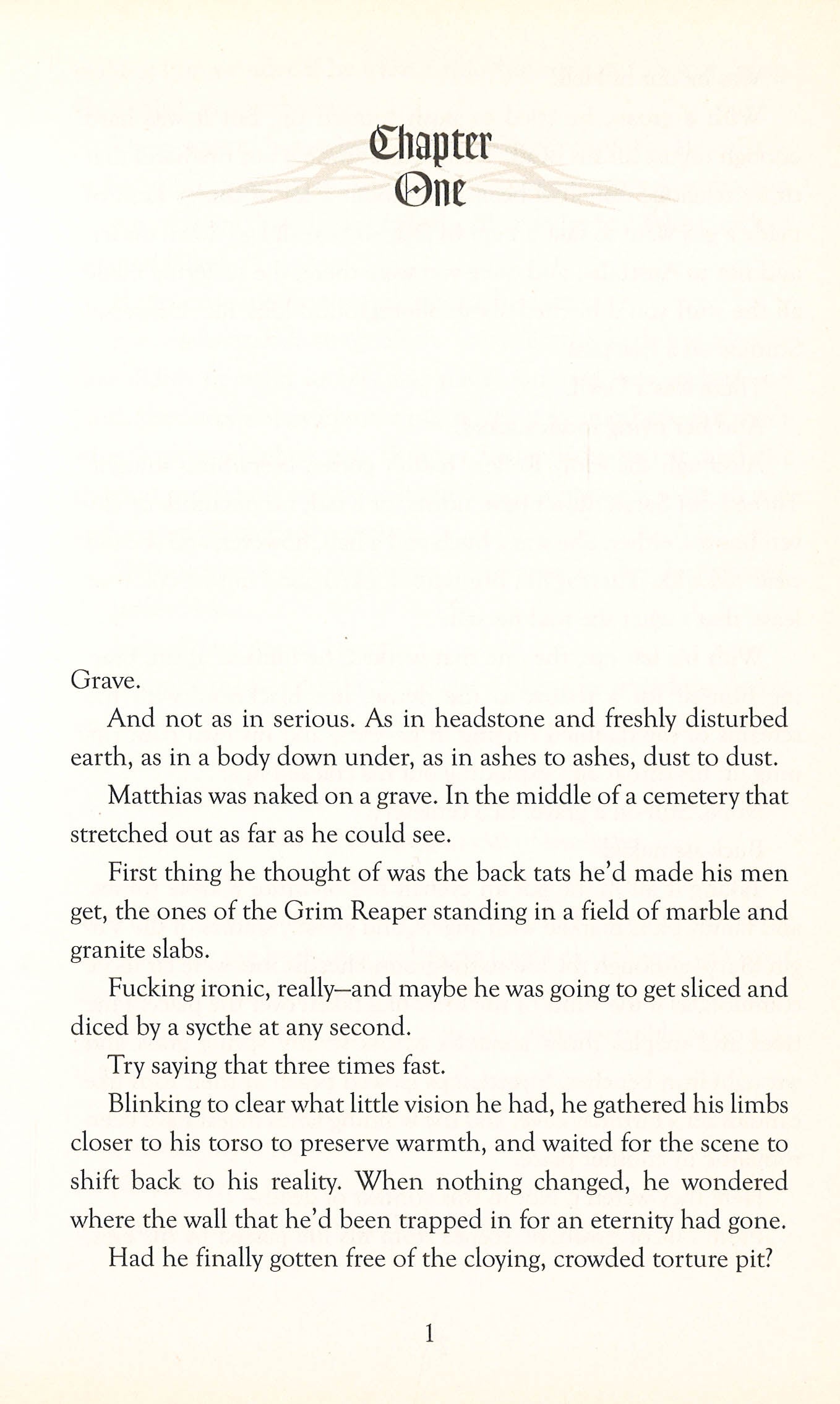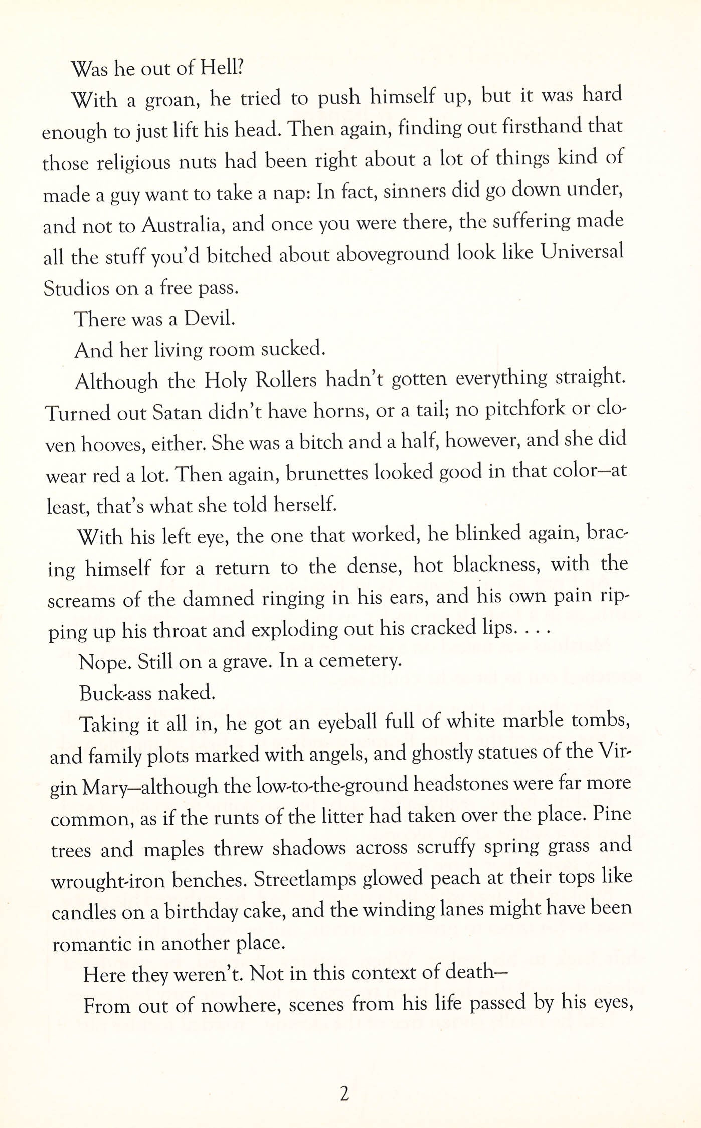 Mels Carmichael, reporter for the Caldwell Courier Journal, gets the shock of her life when a man stumbles in front of her car outside the local cemetery. After the accident, his amnesia is just the kind of mystery she likes to solve, but she soon discovers they're over their heads with his past. Over their heads with passion, too ...As shadows walk the line between reality and another realm, and her lover's memory begins to come back, the two of them learn that nothing is truly dead and buried. Especially when you're trapped in a no-holds-barred war between angels and demons. With a soul on the line, and Mels's heart at risk, what in heaven - or in hell - will it take to save them both?