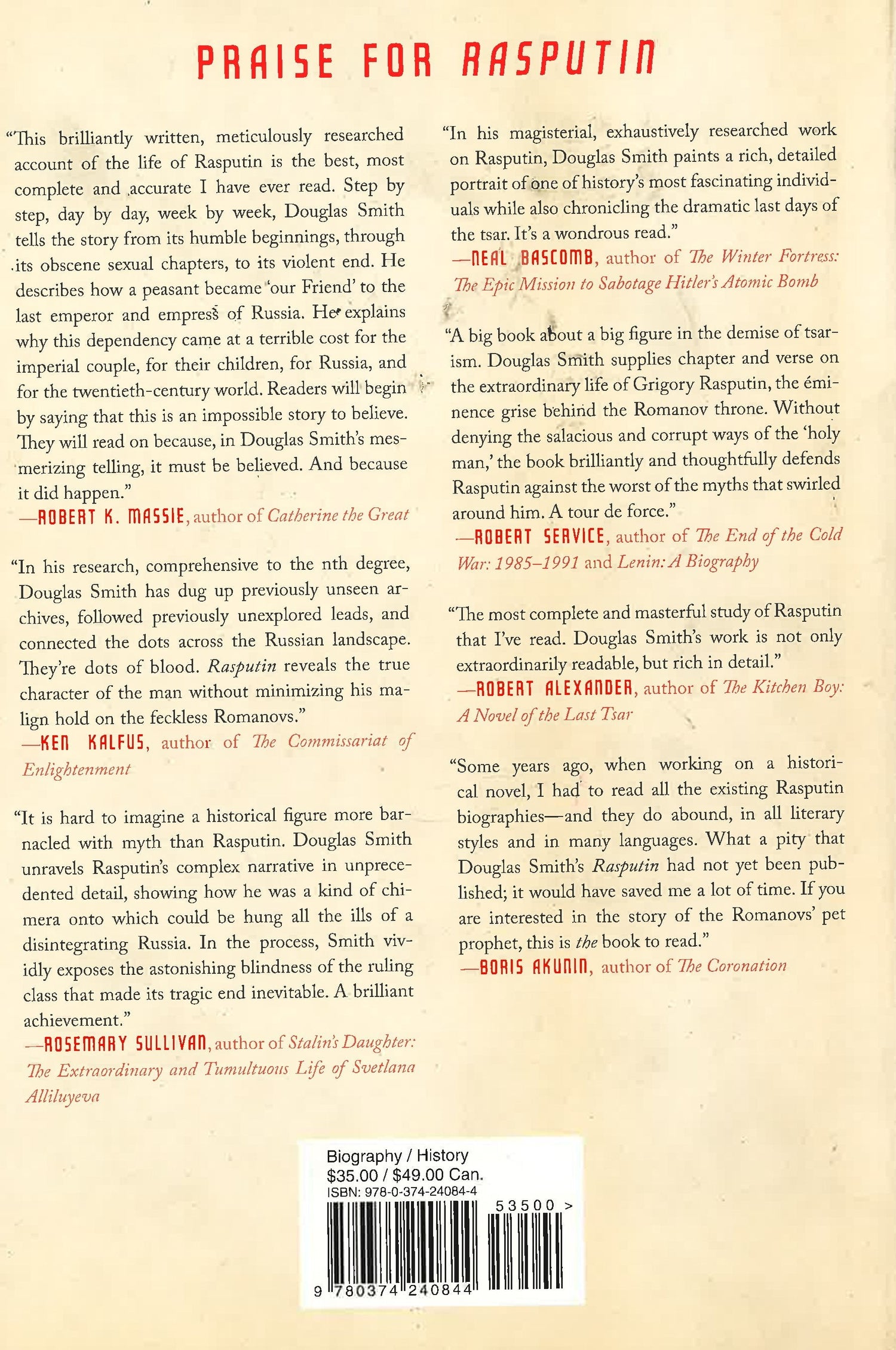 On the centenary of the death of Rasputin comes a definitive biography that will dramatically change our understanding of this fascinating figure A hundred years after his murder, Rasputin continues to excite the popular imagination as the personification of evil. Numerous biographies, novels, and films recount his mysterious rise to power as Nicholas and Alexandra's confidant and the guardian of the sickly heir to the Russian throne. His debauchery and sinister political influence are the stuff of legend, and the downfall of the Romanov dynasty was laid at his feet. But as the prizewinning historian Douglas Smith shows, the true story of Rasputin's life and death has remained shrouded in myth. A major new work that combines probing scholarship and powerful storytelling, Rasputin separates fact from fiction to reveal the real life of one of history's most alluring figures. Drawing on a wealth of forgotten documents from archives in seven countries, Smith presents Rasputin in all his complexity--man of God, voice of peace, loyal subject, adulterer, drunkard. Rasputin is not just a definitive biography of an extraordinary and legendary man but a fascinating portrait of the twilight of imperial Russia as it lurched toward catastrophe.