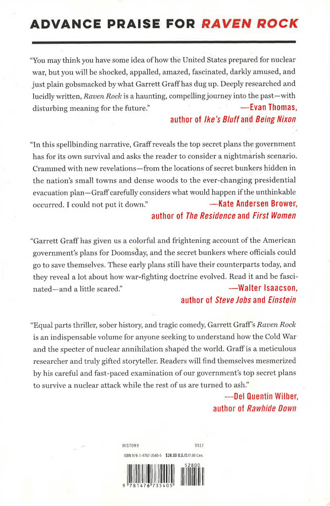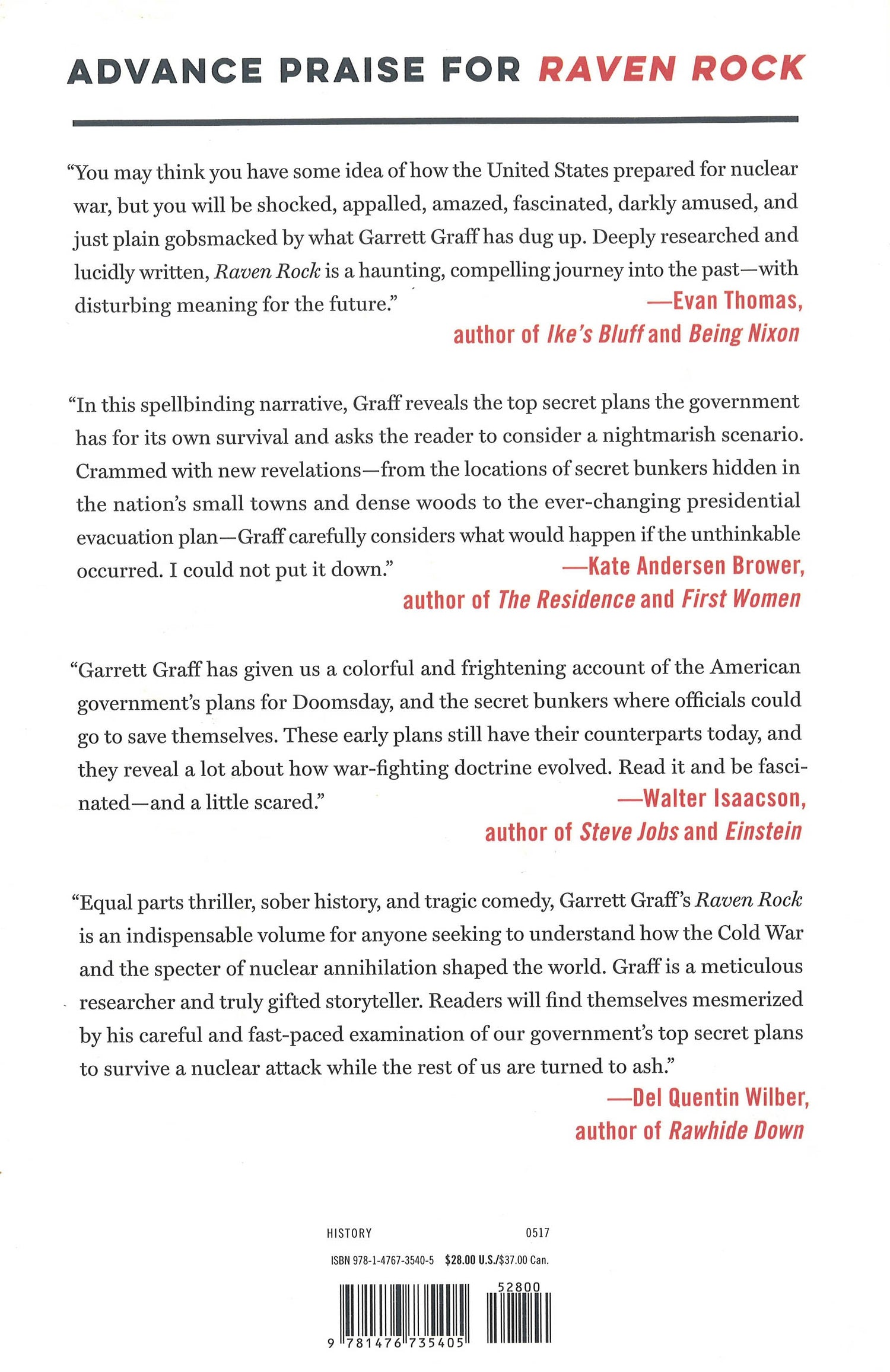 The eye-opening true story of the government's secret plans to survive and rebuild after a catastrophic attack on US soil--a narrative that spans from the dawn of the nuclear age to today. Every day in Washington, DC, the blue-and-gold 1st Helicopter Squadron, code-named "MUSSEL," flies over the Potomac River. As obvious as the presidential motorcade, the squadron is assumed by most people to be a travel perk for VIPs. They're only half right: while the helicopters do provide transport, the unit exists to evacuate high-ranking officials in the event of a terrorist or nuclear attack on the capital. In the event of an attack, select officials would be whisked by helicopters to a ring of secret bunkers around Washington, even as ordinary citizens are left to fend for themselves. For sixty years, the US government has been developing secret Doomsday plans to protect itself, and the multibillion-dollar Continuity of Government (COG) program takes numerous forms--from its plans to evacuate the Liberty Bell from Philadelphia and our most precious documents from the National Archives to the plans to launch nuclear missiles from a Boeing 747 jet flying high over Nebraska. In Raven Rock, Garrett Graff sheds light on the inner workings of the 650-acre compound (called Raven Rock) just miles from Camp David, as well as dozens of other bunkers the government built its top leaders during the Cold War, from the White House lawn to Cheyenne Mountain in Colorado to Palm Beach, Florida, and the secret plans that would have kicked in after a Cold War nuclear attack to round up foreigners and dissidents, and nationalize industries. Equal parts a presidential, military, and political history, Raven Rock tracks the evolution of the government's plans and the threats of global war from the dawn of the nuclear era through the present day. Relying upon thousands of pages of once-classified documents, as well as original interviews and visits to former and current COG facilities, Graff brings readers through the back channels of government to understand exactly what is at stake if our nation is attacked, and how we're prepared to respond if it is.