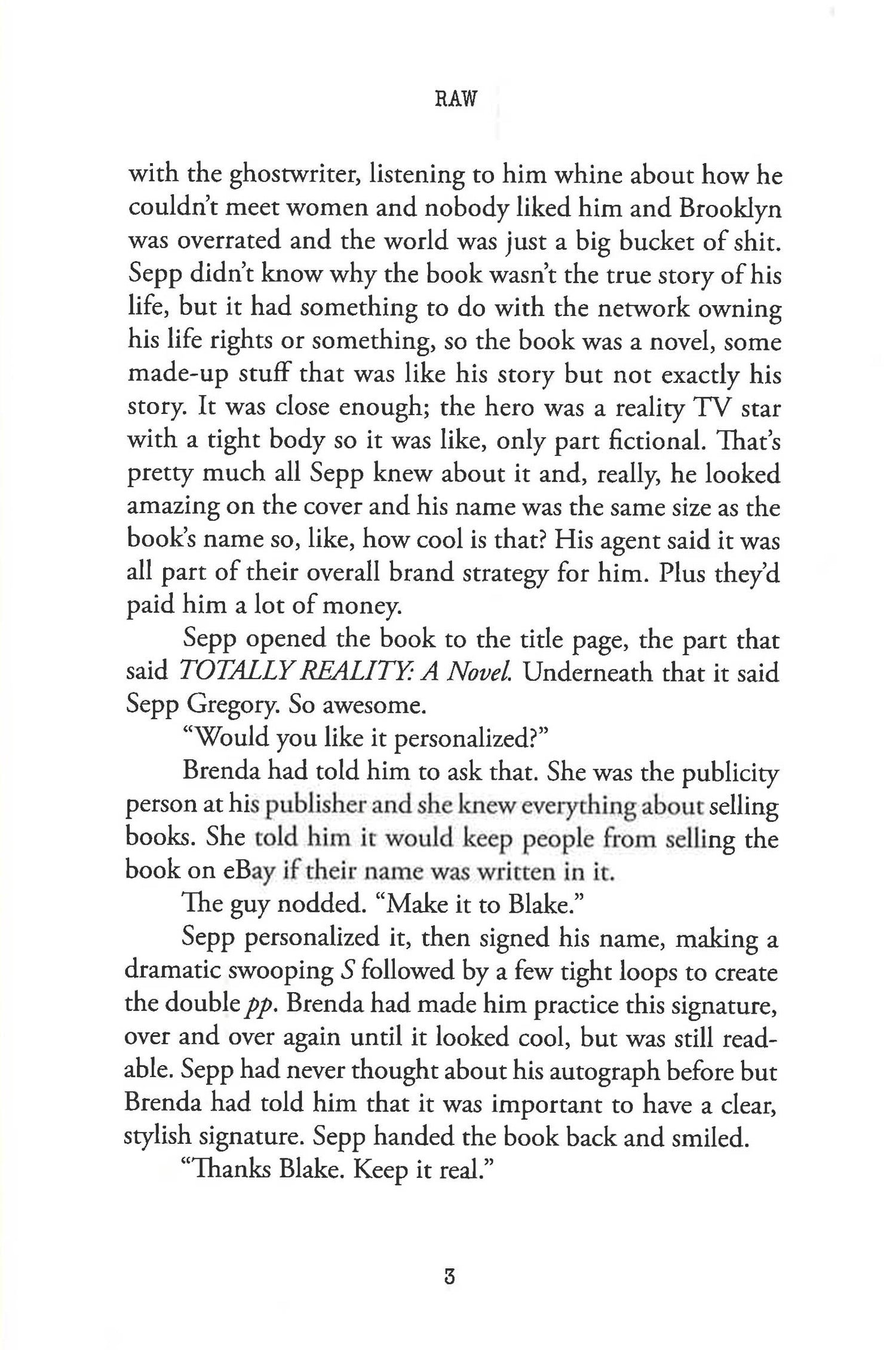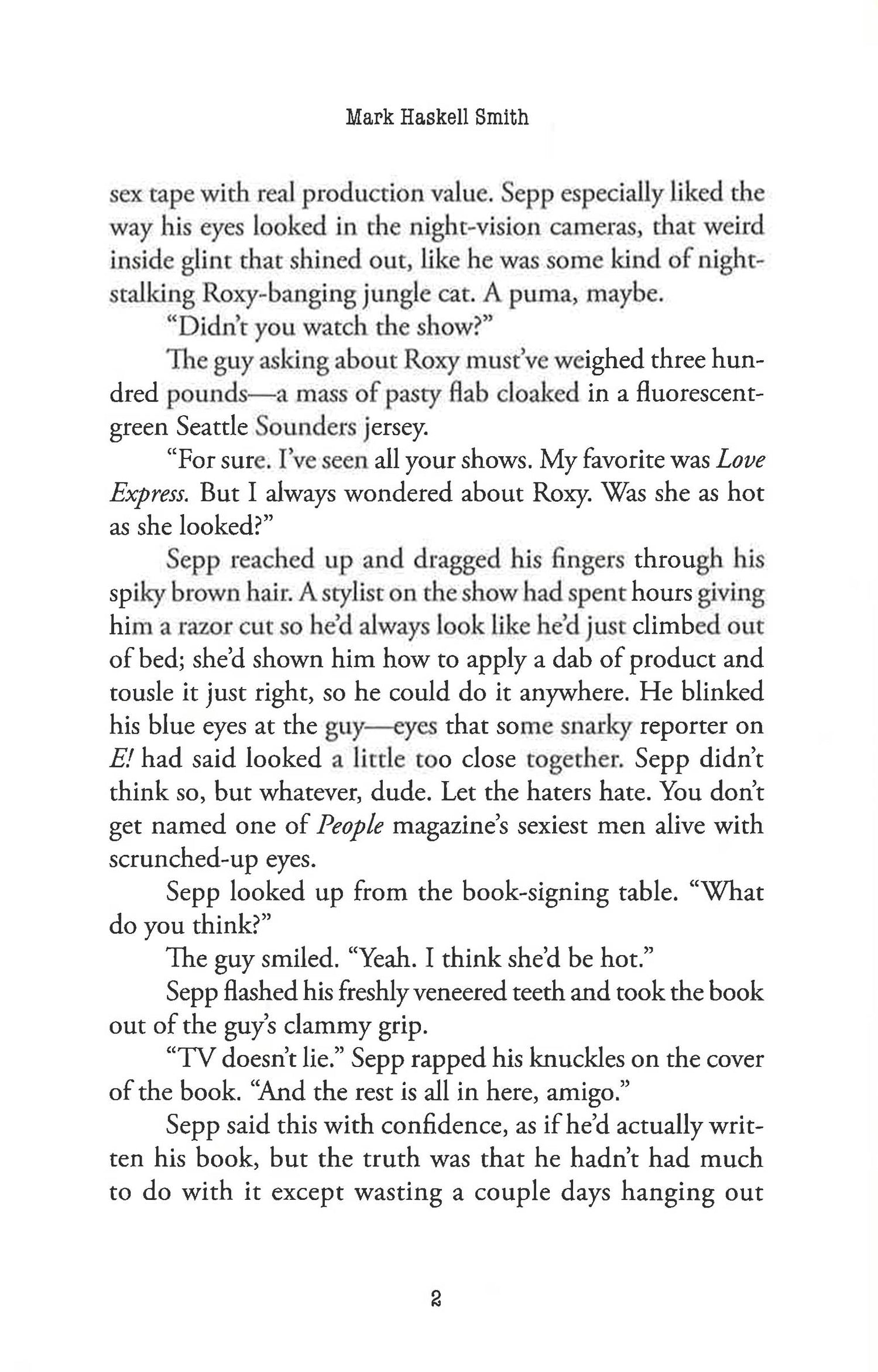 Reality TV hunk and People magazine's "sexiest man alive", Sepp Gregory goes on a book tour to promote his debut novel, a thinly veiled autobiography. Not that Sepp has actually read the book, he doesn't have to, he lived it! The book becomes a sensation, a New York Times bestseller, and, surprisingly, it even gets rave reviews from serious critics. Aside from Harriet Post, that is.