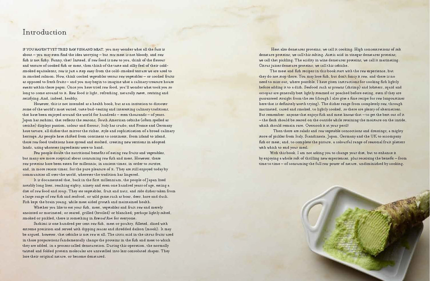 This book has a wealth of ideas for preparing and presenting raw fish, meat, vegetables and fruits, but also provides variations if you prefer them lightly cooked, whether fleetingly applying the searing heat of a griddle, the flame of a blow torch, a waft of hot or cold smoke, a surge of bubbling stock, or a brief encounter with a pickling potion, merely to seal the succulence within.