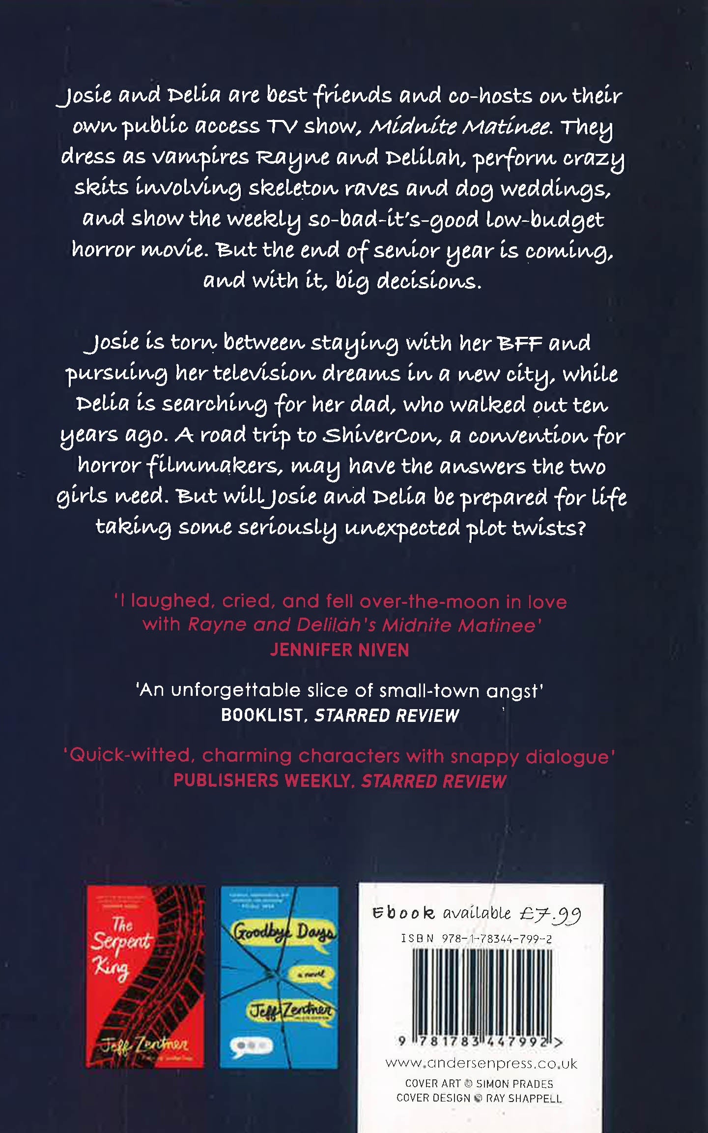 Josie and Delia are best friends and co-hosts on their own public access TV show, Midnite Matinee. They dress as vampires Rayne and Delilah, perform daft skits involving skeleton raves and dog weddings, and show the weekly so-bad-it's-good low-budget horror movie. But the end of senior year is coming, and Josie is torn between pursuing her television dreams in a new city or staying making TV with her BFF. What's more, she's just met a boy, Lawson, who is totally not her type, but is just a little bit intriguing . . . Meanwhile, Delia is searching for her dad, who walked out on her and her mom ten years ago. When the private investigator she hired unearths his contact details, she agonises over digging up the past.