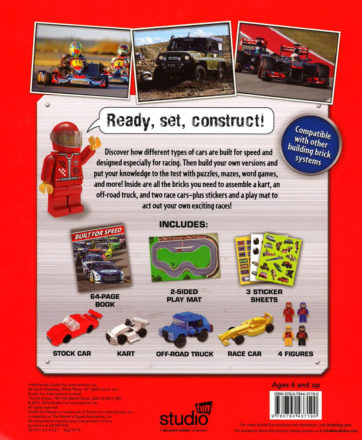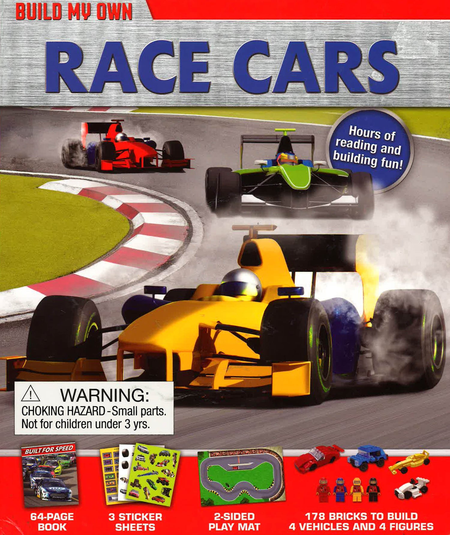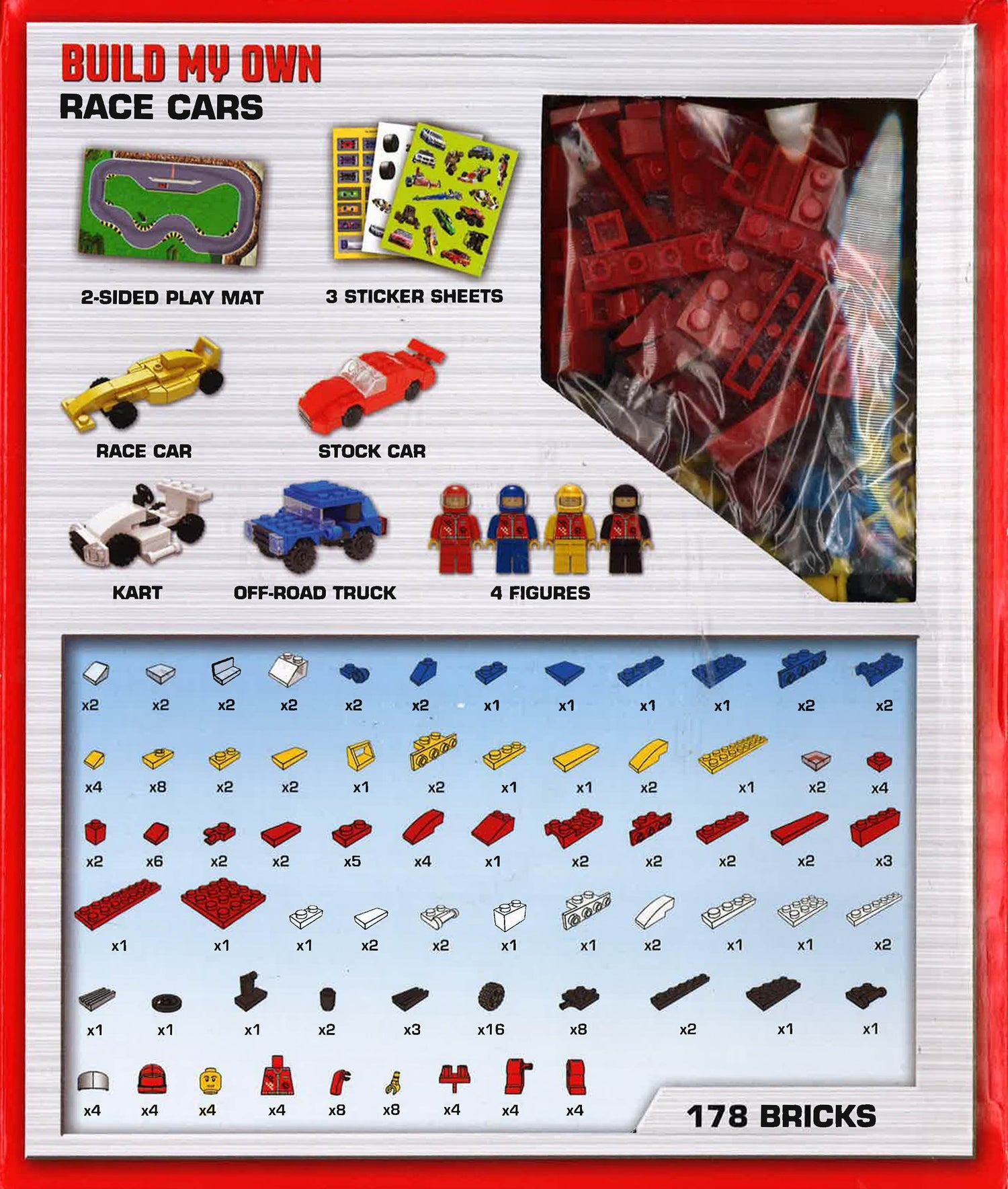 Inside are all the bricks you need to assemble a kart, an off-road truck, and two race-cars - plus stickers and a play mat to act out your own exciting races!