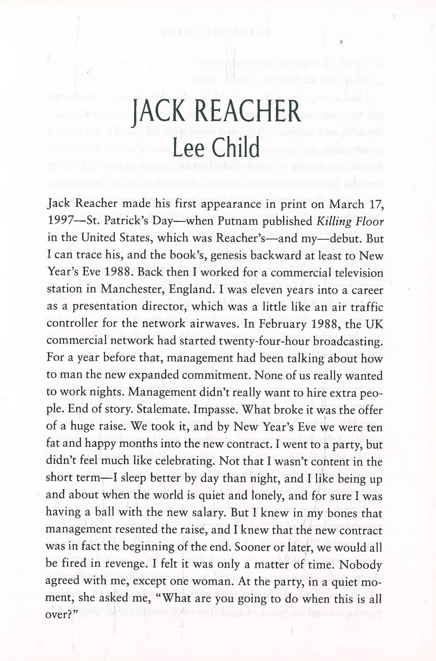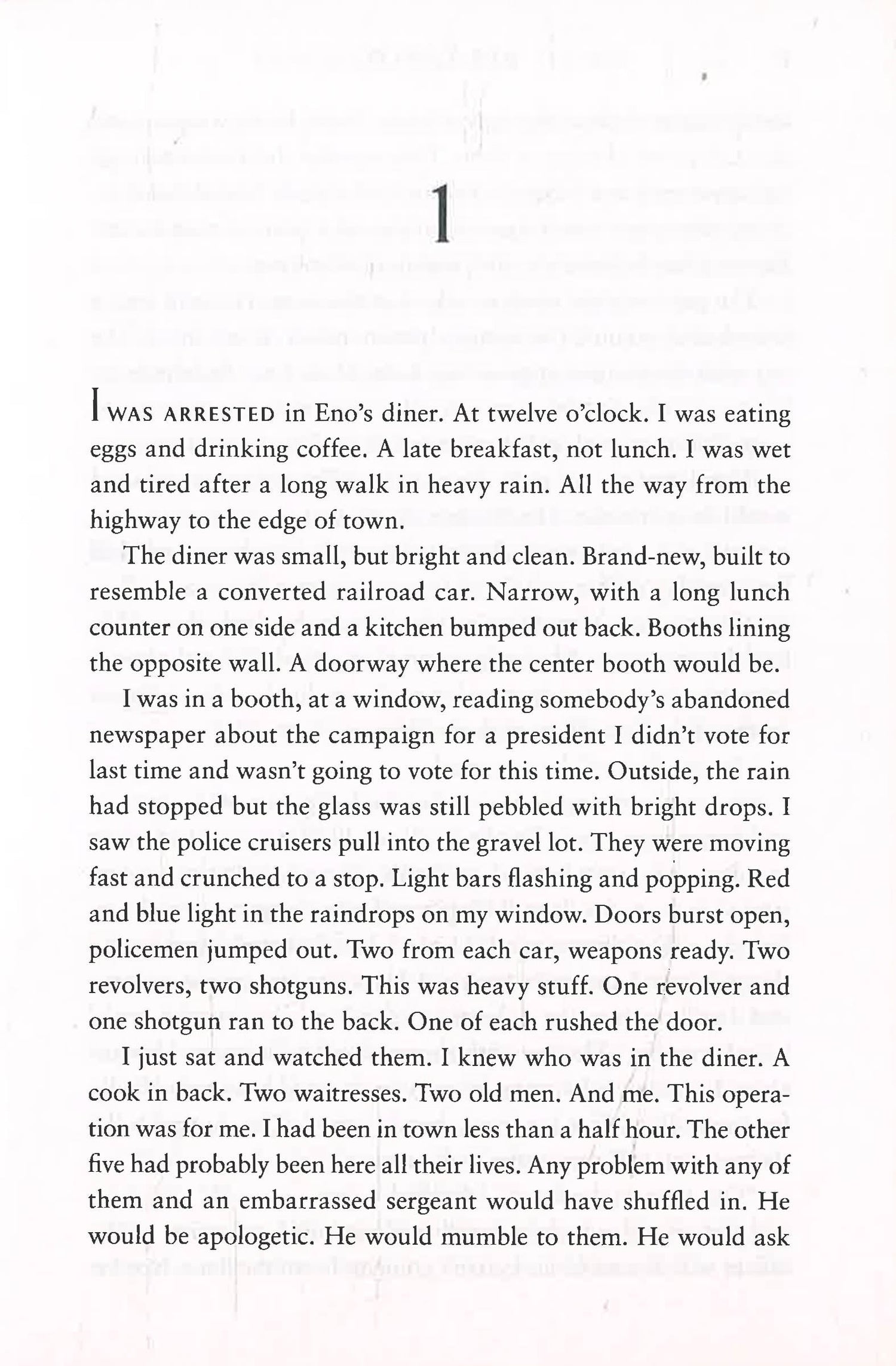 Ex-military policeman Jack Reacher is a drifter. He’s just passing through Margrave, Georgia, and in less than an hour, he’s arrested for murder. Not much of a welcome. All Reacher knows is that he didn’t kill anybody. At least not here. Not lately. But he doesn’t stand a chance of convincing anyone. Not in Margrave, Georgia. Not a chance in hell.