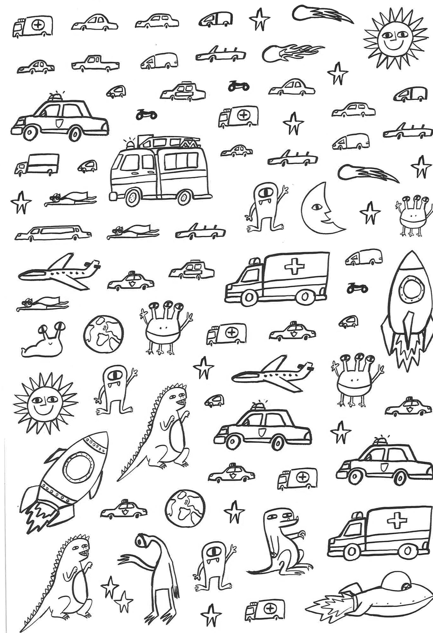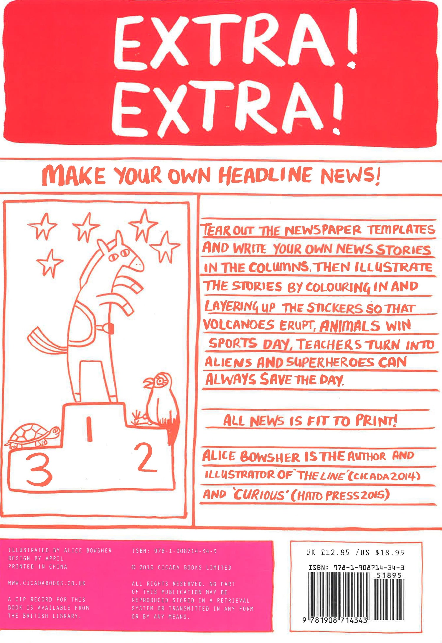 Make your own headline news! Fifty pages of tear-out newspaper layouts correspond to twenty sticker pages of partially drawn images and headlines. Kids are invited to color and complete the stickers, layering them up so that volcanoes erupt, schools explode, teachers are sent to prison, and moms win Oscars. Column space alongside gives plenty of room for hilarious accompanying stories. Humorous and warm, this book is a great way of getting kids excited about creative writing. Alice Bowsher's pen and ink drawings are exploding with fun. She is the author and illustrator of The Line (Cicada 2014) and Curious (Hato Press 2015).
