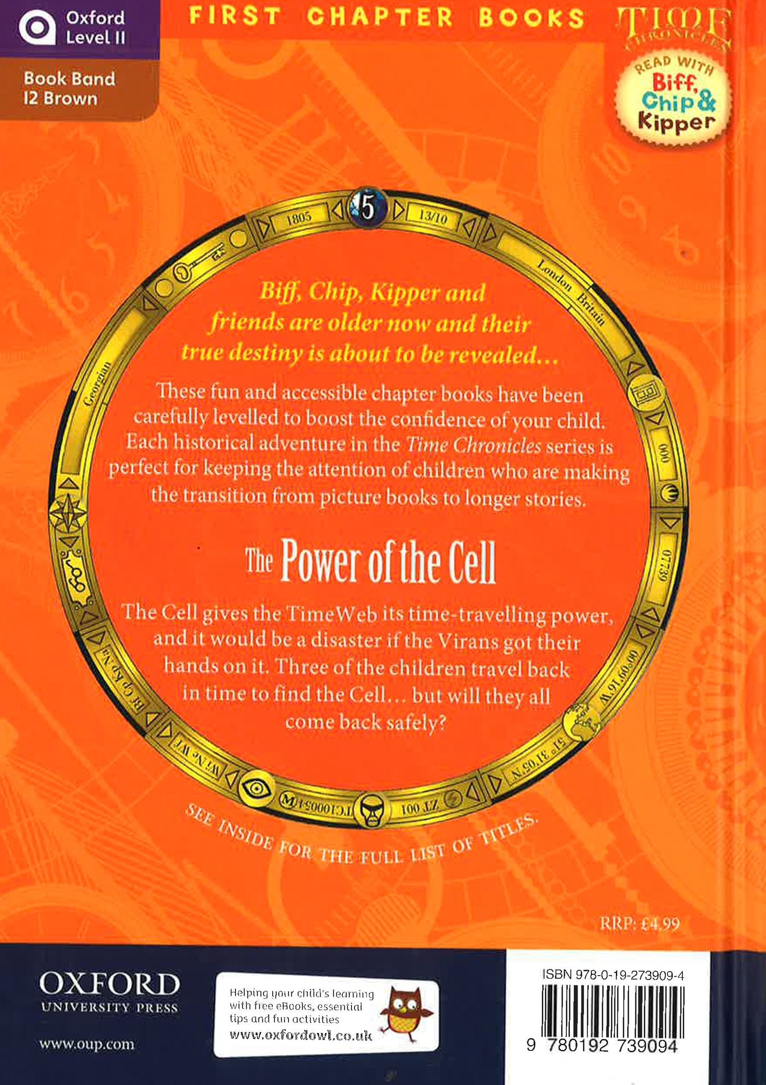 Biff, Chip, Kipper and friends are older now and their true destiny is about to be revealed. Join them as they embark on the mission of a lifetime! In Book 5, The Power of the Cell, Wilma, Nadim and Kipper are reunited, but are tricked by some Virans into thinking they are their friends. How will they gain control of the Cell - and will all three of them make it back through the doorway? Time Chronicles is a series of fun and accessible chapter books perfect for moving your child on from picture books to longer stories. Each book in the series is a thrilling story in its own right, as the children fight to save the world from the evil Virans. The books are carefully levelled to boost the confidence of the child, whilst also introducing more vibrant and interesting vocabulary. They are perfect for keeping the attention of all children with fast paced action. Set in a real historical time with characters from the past, these books are packed full of extras including questions, historical fact files, character information, photos, artwork and glossaries. Support for parents is also included. Time Chronicles are part of Read with Biff, Chip & Kipper - the UK's most popular home reading series.