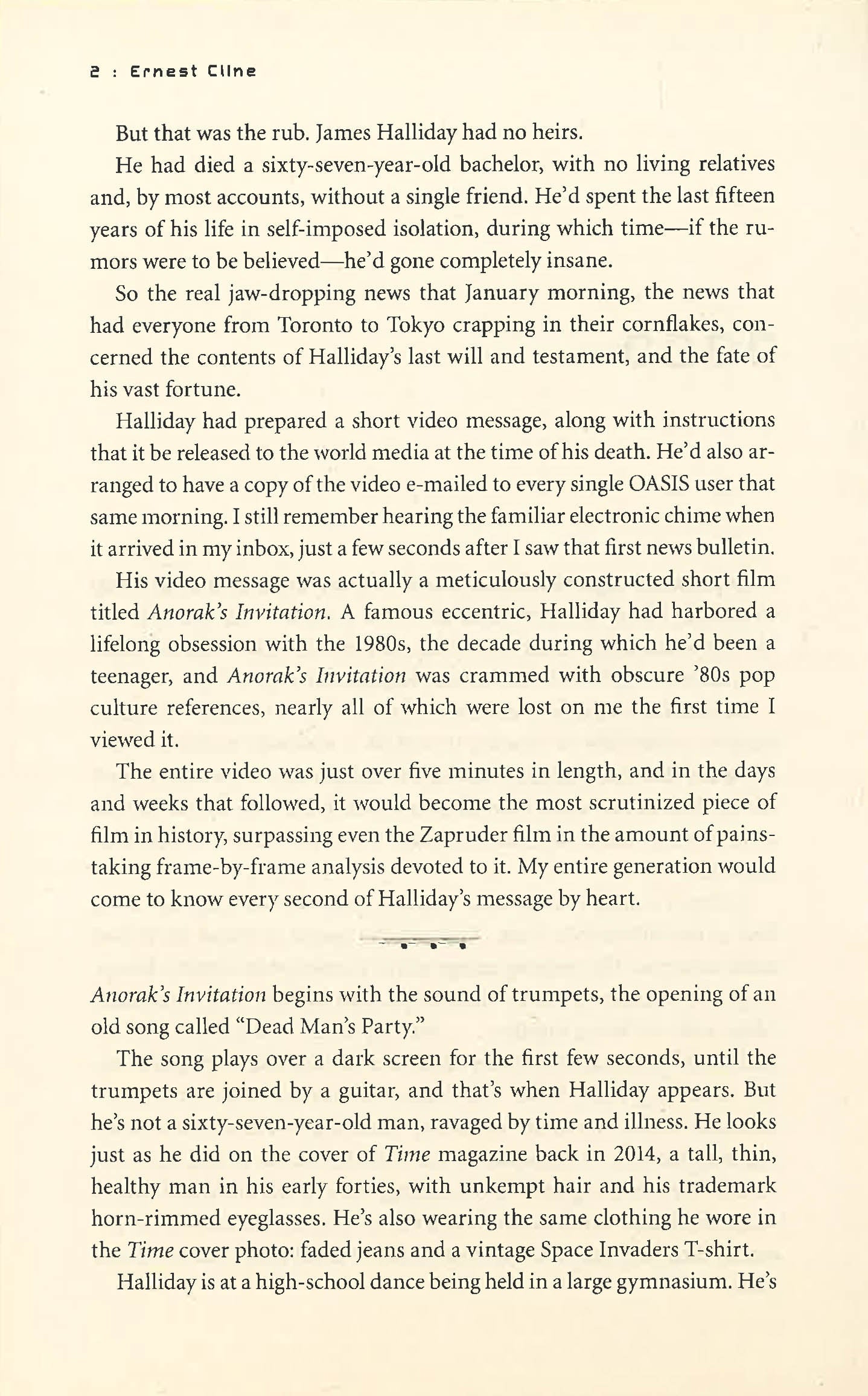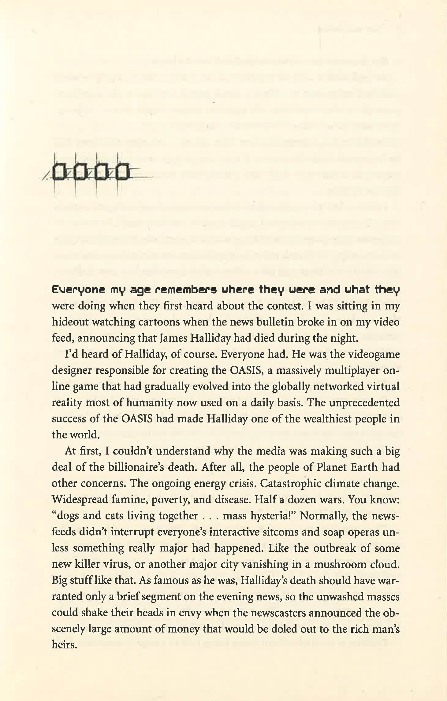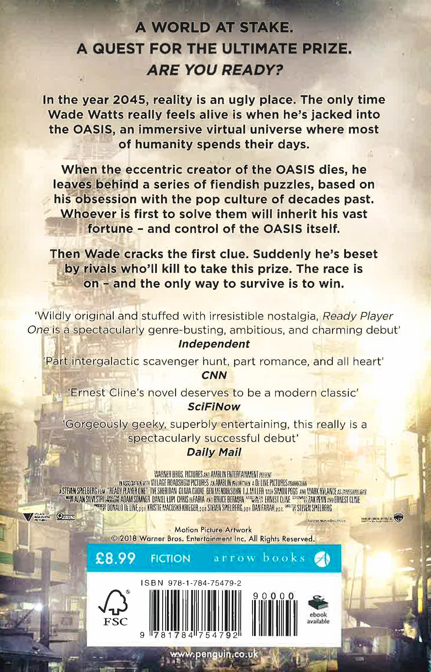 A world at stake. A quest for the ultimate prize. Are you ready? It's the year 2044, and the real world has become an ugly place. We're out of oil. We've wrecked the climate. Famine, poverty, and disease are widespread. Like most of humanity, Wade Watts escapes this depressing reality by spending his waking hours jacked into the OASIS, a sprawling virtual utopia where you can be anything you want to be, where you can live and play and fall in love on any of ten thousand planets. And like most of humanity, Wade is obsessed by the ultimate lottery ticket that lies concealed within this alternate reality: OASIS founder James Halliday, who dies with no heir, has promised that control of the OASIS - and his massive fortune - will go to the person who can solve the riddles he has left scattered throughout his creation. For years, millions have struggled fruitlessly to attain this prize, knowing only that the riddles are based in the culture of the late twentieth century. And then Wade stumbles onto the key to the first puzzle.Suddenly, he finds himself pitted against thousands of competitors in a desperate race to claim the ultimate prize, a chase that soon takes on terrifying real-world dimensions - and that will leave both Wade and his world profoundly...