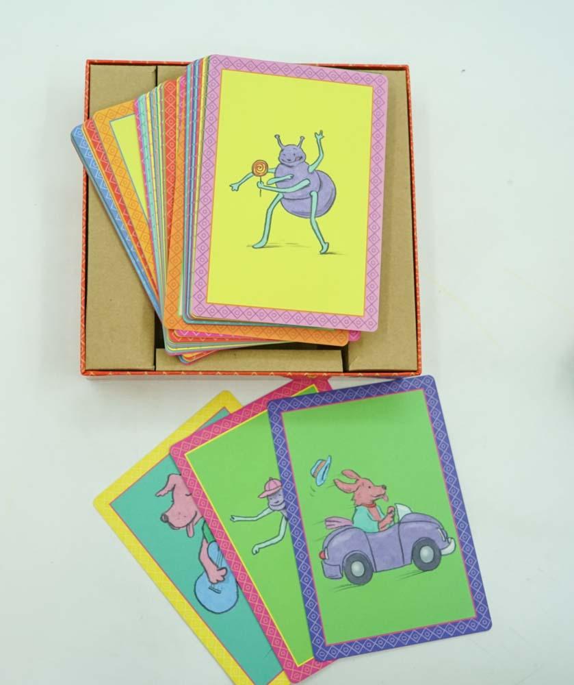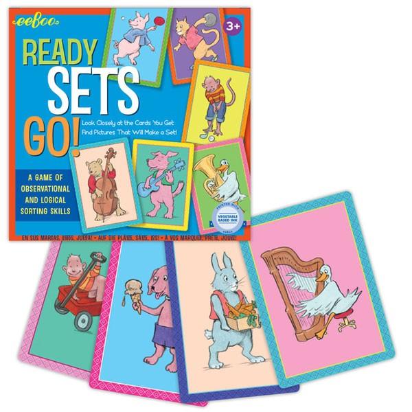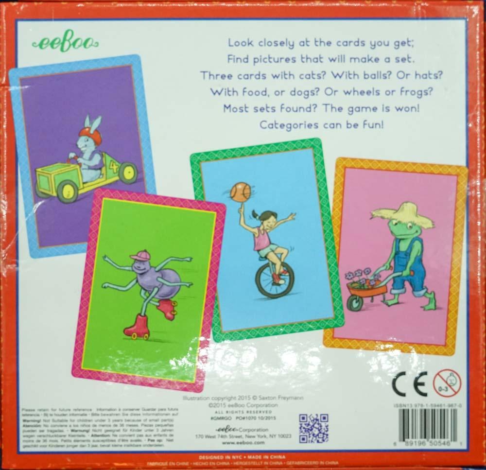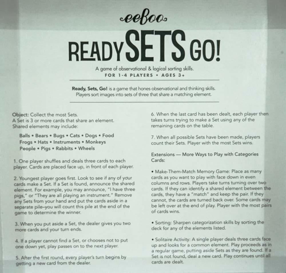 Look closely at the cards you gets; Find pictures that will make a set. Three cards with cats? With balls? Or hats? With food, or dogs? Or wheels or frogs? Most sets found? The game is won! Categories can be fun!