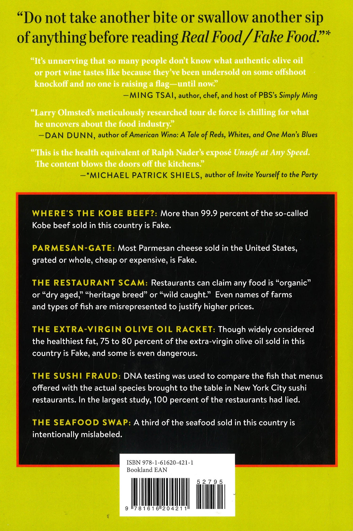 You've seen the headlines: Parmesan cheese made from wood pulp. Lobster rolls containing no lobster at all. Extra-virgin olive oil that isn't. So many fake foods are in our supermarkets, our restaurants, and our kitchen cabinets that it's hard to know what we're eating anymore. In Real Food / Fake Food, award-winning journalist Larry Olmsted convinces us why real food matters and empowers consumers to make smarter choices. Olmsted brings readers into the unregulated food industry, revealing the shocking deception that extends from high-end foods like olive oil, wine, and Kobe beef to everyday staples such as coffee, honey, juice, and cheese. It's a massive bait and switch in which counterfeiting is rampant and in which the consumer ultimately pays the price. But Olmsted does more than show us what foods to avoid. A bona fide gourmand, he travels to the sources of the real stuff to help us recognize what to look for, eat, and savor: genuine Parmigiano-Reggiano from Italy, fresh-caught grouper from Florida, authentic port from Portugal. Real foods that are grown, raised, produced, and prepared with care by masters of their craft. Part cautionary tale, part culinary crusade, Real Food / Fake Food is addictively readable, mouthwateringly enjoyable, and utterly relevant.