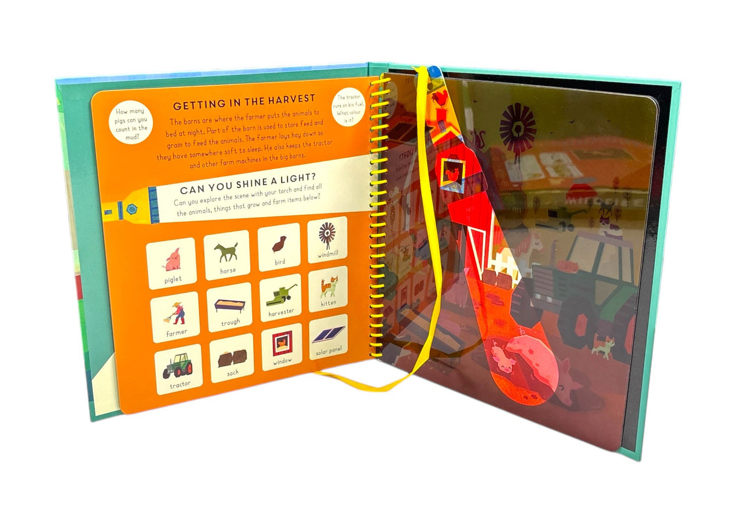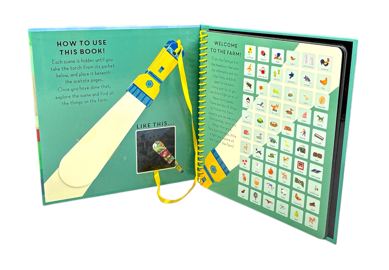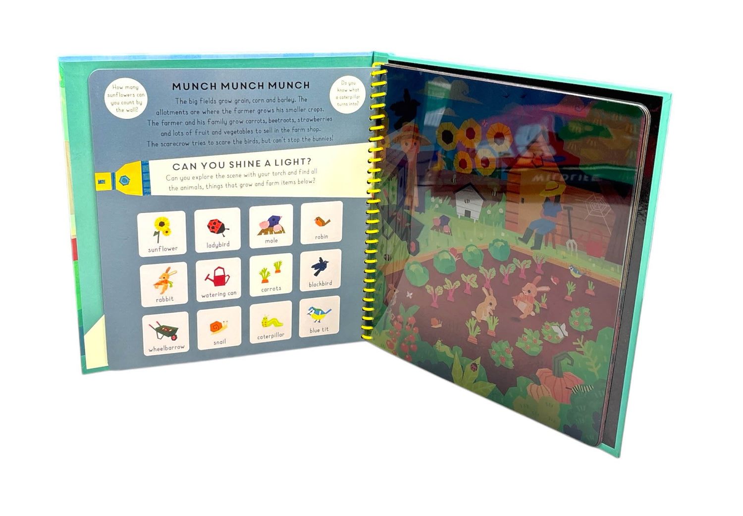 This title includes 5 acetate scenes with sixty 'can you find' items to search out with your magic torch. It features facts, questions and lots of things to learn about a farmyard.