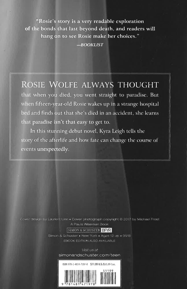 Rosie Wolfe always thought that when you died, you went straight to paradise. But when fifteen-year-old Rosie wakes up in a strange hospital bed and finds out that she's died in an accident, she learns that paradise isn't that easy to get to.In this stunning debut novel, Kyra Leigh tells the story of the afterlife and ow fate can change the course of events unexpectedly.