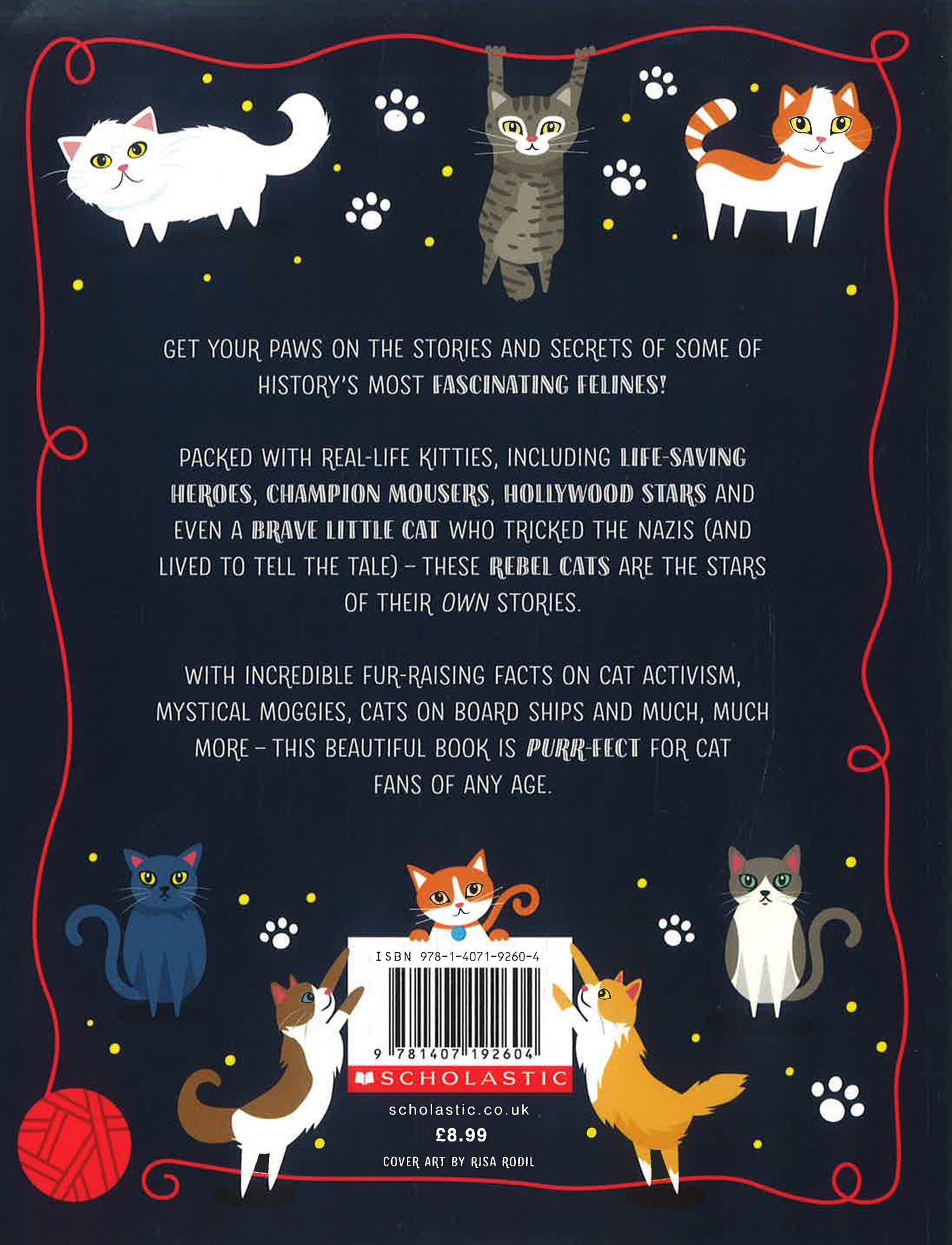 Fur-raising tales of real-life Rebel Cats! Discover secrets, stories and facts about history's most fascinating felines! An engaging collection about cats who are the heroes of their own stories, Rebel Cats introduces us to fur-raising facts and adventures from around the world and across the centuries. With profiles of over 30 real-life felines, including WWII heroes, courageous adventurers, a Guinness World Record holder and even an astrocat that travelled in space (and made it back to Earth to tell the tale). Plus tons of information on cat activism, feline myths and more! Rebel Cats is the perfect gift for any cat lover, all year round!