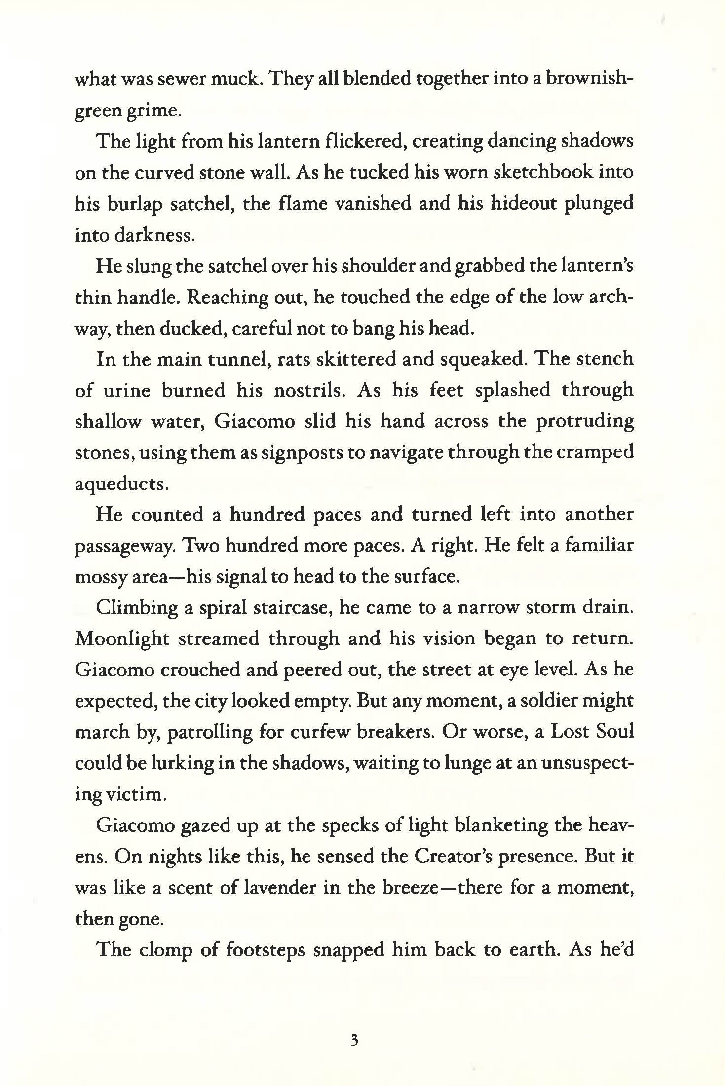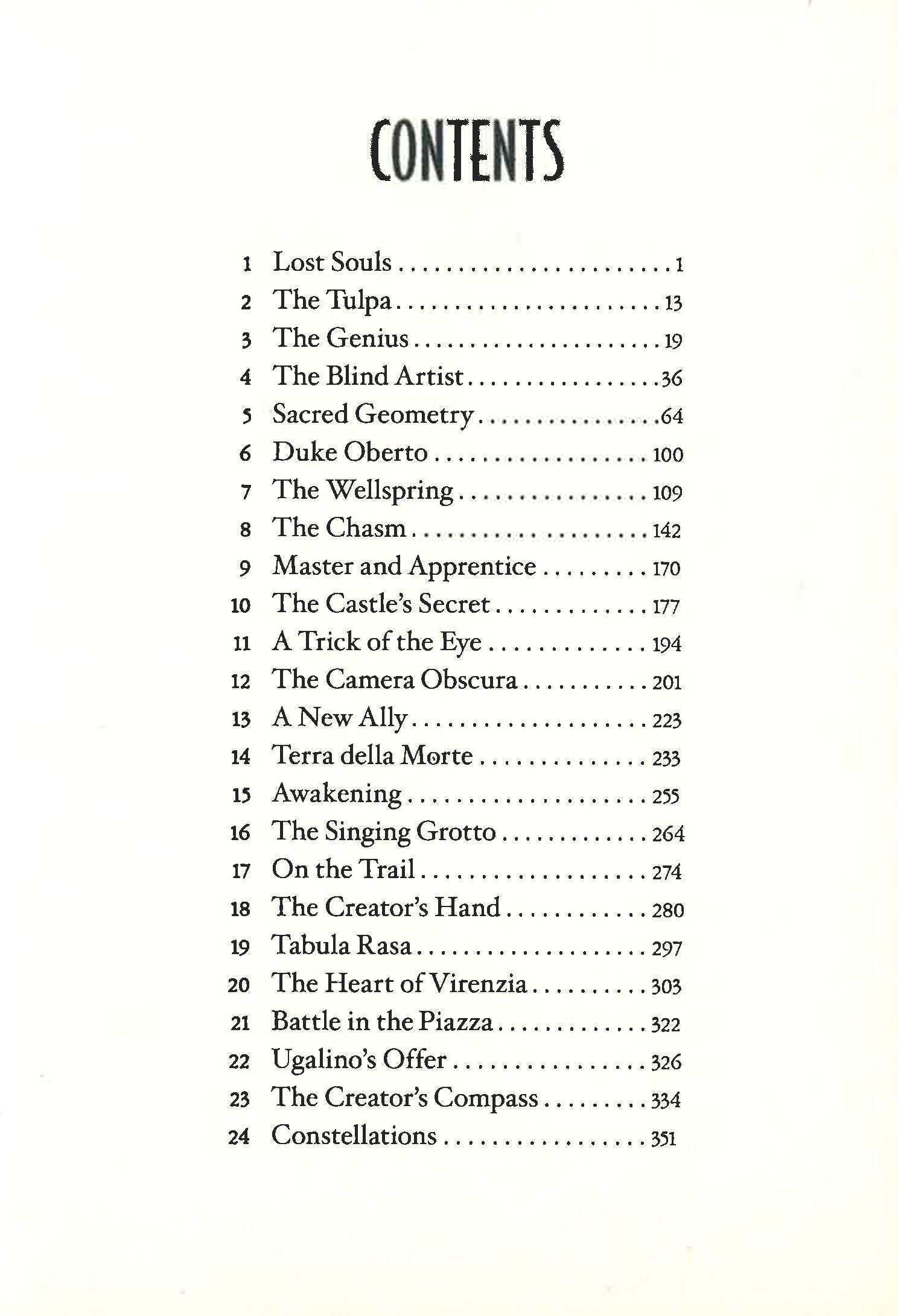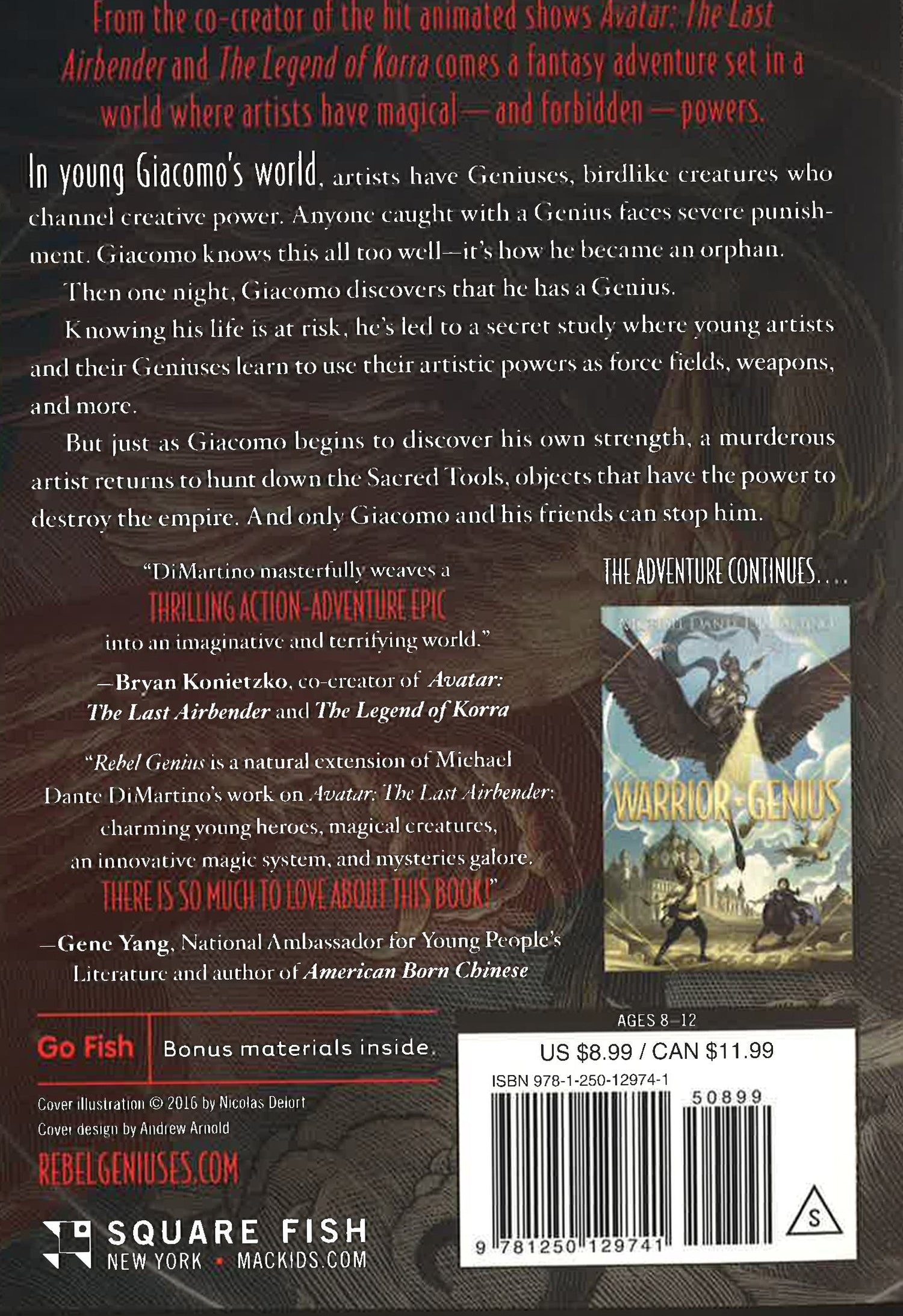 In twelve-year-old Giacomo's Renaissance-inspired world, art is powerful, dangerous, and outlawed. A few artists possess Geniuses, birdlike creatures that are the living embodiment of an artist's creative spirit. Those caught with one face a punishment akin to death, so when Giacomo discovers he has a Genius, he knows he's in serious trouble.Luckily, he finds safety in a secret studio where young artists and their Geniuses train in sacred geometry to channel their creative energies as weapons.But when a murderous artist goes after the three Sacred Tools - objects that would allow him to destroy the world and everyone in his path - Giacomo and his friends must risk their lives to stop him.