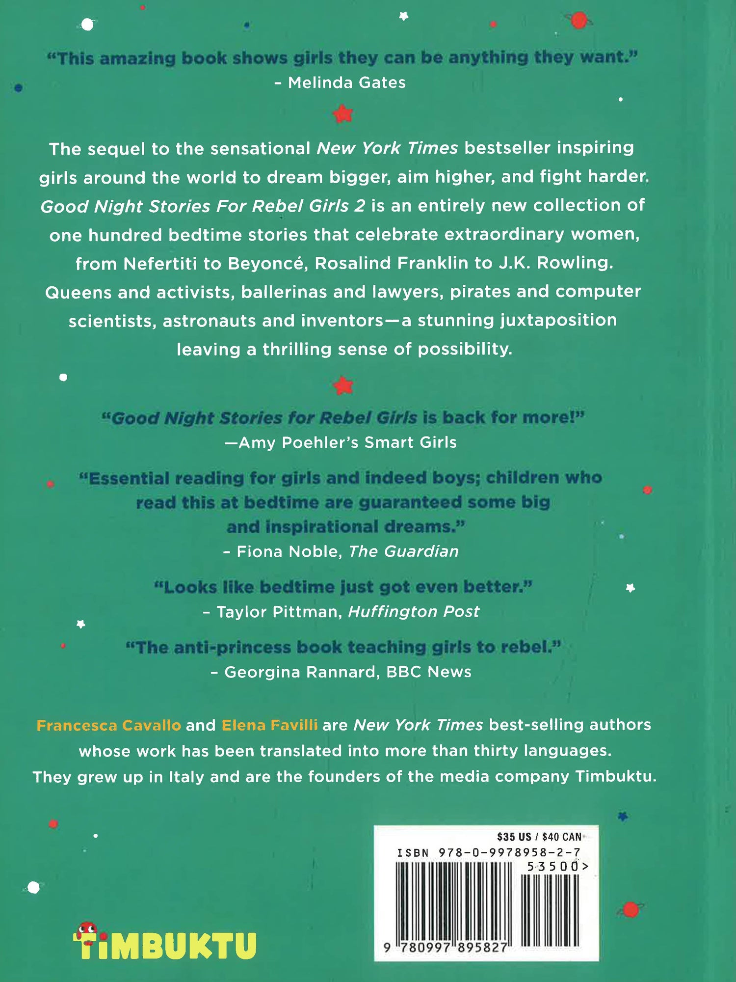 Good Night Stories for Rebel Girls 2 boasts a brand-new graphic design, a glossary, and full-page, full-color portraits of each subject, created by the best female artists of our time.