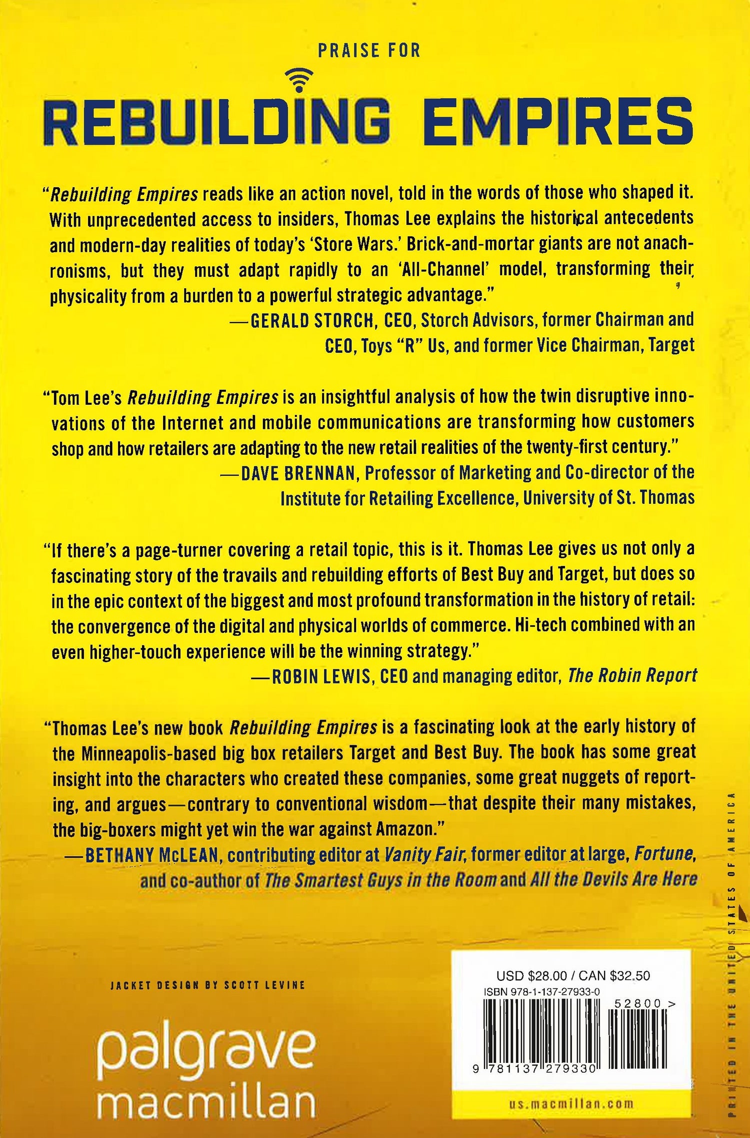 Rebuilding Empires " examines, through retail giants Best Buy and Target, how big box chains are constructing a new future by utilizing mobile devices, social media, and the Internet, the same technologies that once pushed them to the brink of irrelevance. This book features interviews with industry leaders and experts, including Best Buy CEO Hubert Joly, Target chief marketing officer Jeff Jones, and several other key players in both companies. Bricks and mortar retailing is not dead, and Best Buy shows others how to capitalize on their own physical spaces. Lee shows how showrooming is an asset rather than a liability, how physical space and online space are complementary, and how others can learn from Best Buy's innovations including the Geek Squad, stores within stores, and creating non-traditional partnerships. In a readable narrative format, journalist Thomas Lee explores how the world's largest consumer electronics retailer is redefining what it truly means to be a "Best Buy" in the age of online retailing.