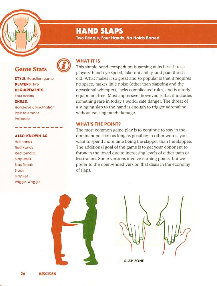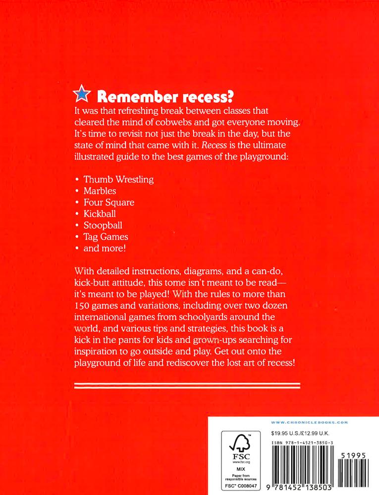 Remember recess? It was that refreshing break between classes that cleared the cobwebs, refreshed the mind, and got everyone moving. Recess is the ultimate illustrated guide to the best games of the playground, for inside and outside. With detailed instructions, diagrams, and a can-do, kick-butt attitude, this tome isn't meant to be read - it's meant to be played! This fun and interactive guide includes the rules to over 150 games and variations, including over two dozen international games from schoolyards around the world, plus various tips and strategies not just to play, but also to win!