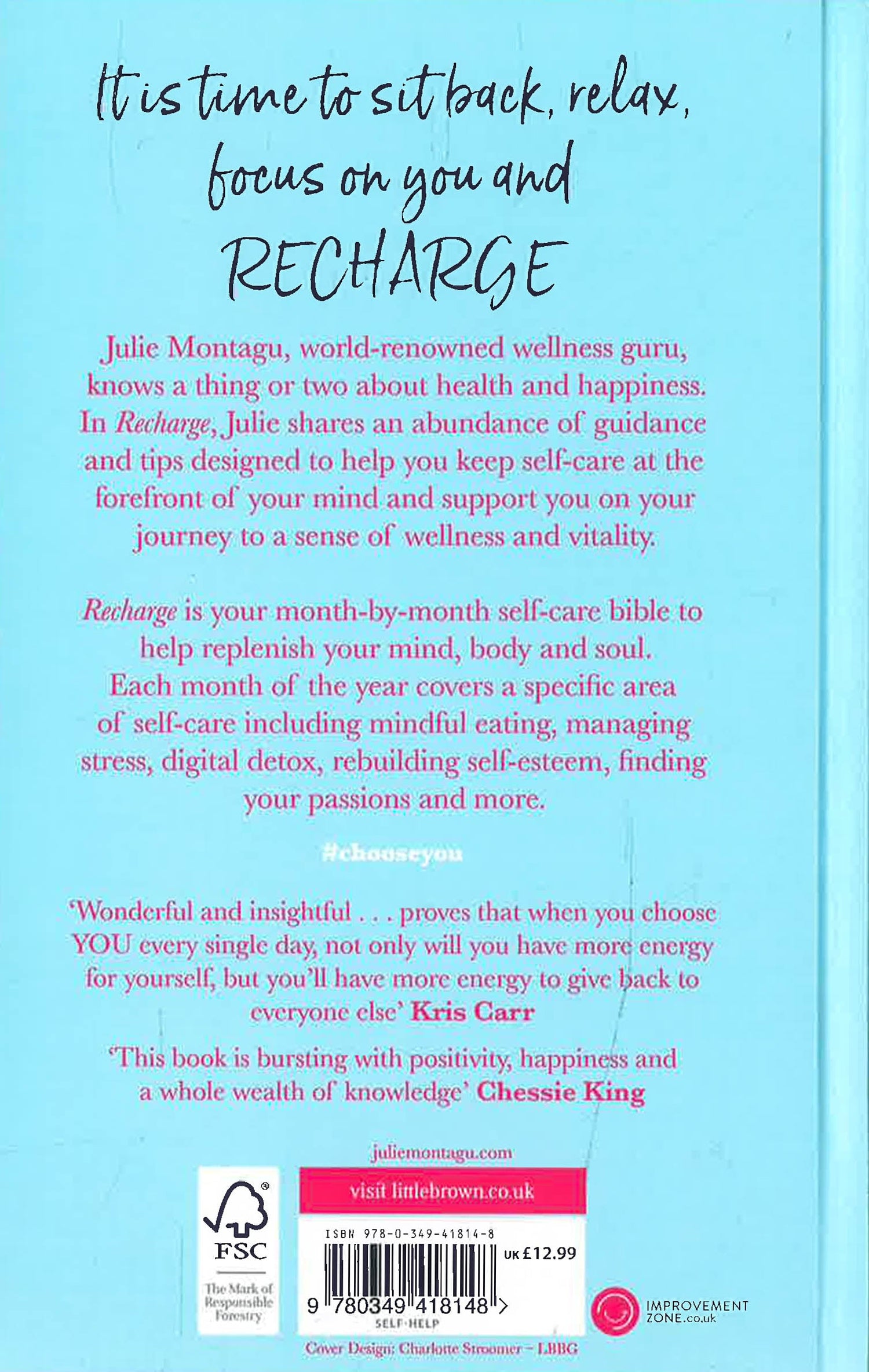 A month-by-month self-care bible by world-renowned wellness guru Julie Montagu.'The ultimate self-care bible for women who want to find their balance in life' Mel Wells'Wonderful and insightful . . .proves that when you choose YOU every single day, not only will have you have more energy for yourself, but you'll have more energy to give back to everyone else.' Kris Carr'This book is bursting with positivity, happiness & a whole wealth of knowledge' Chessie KingRecently named one of the top ten holistic health icons in the world, Julie Montagu knows a thing or two about health and happiness. In Recharge, Montagu shares an abundance of guidance, tips and advice designed to help you keep self-care at the forefront of your mind and support you on your journey to a well-rounded sense of wellness.Recharge is your month-by-month self-care bible to help replenish your mind, body and soul. Each month of the year covers a specific area of self-care including mindful eating, managing stress, digital detox, rebuilding self-esteem, finding your passions and more.