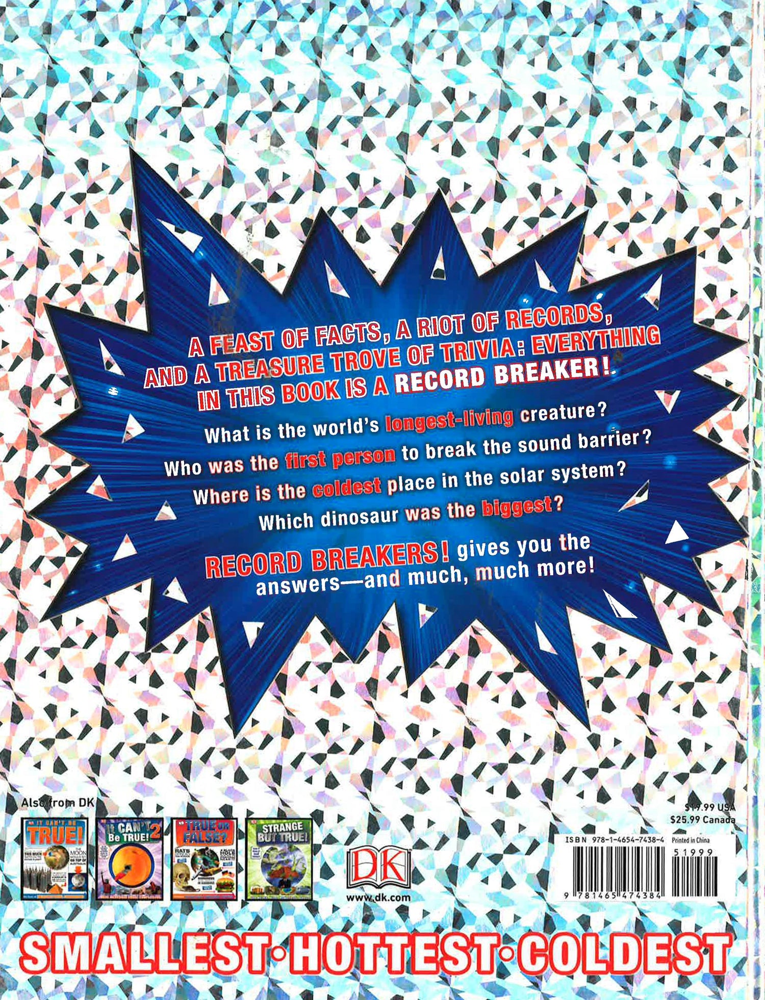 Amazing facts about people, animals, Earth, and space pack this fantastic kids' book of world records. It's the perfect gift book for children ages 9-11. Witness jaw-dropping, record-breaking feats by extraordinary people and animals in this visual guide to amazing achievements. Record Breakers brings you the first, fastest, longest, largest, biggest, and best records in the world. Track the longest shark migration (12,400 miles/(20,000 km); visit the coolest place on the planet (Vostok Station, Antarctica: a chilling -128.6°F/ -89.2°C); see how plane pioneer Chuck Yeager first broke the sound barrier, and much more. The greatest human achievements are showcased, from pioneering inventors to modern feats of engineering, technology, transportation, and sports. But there's far more than just people power in the book, there are also records about animals, plants, and our amazing natural world, Earth, and space. Find out all about the best of everything in Record Breakers--an entertaining and educational book for the whole family.