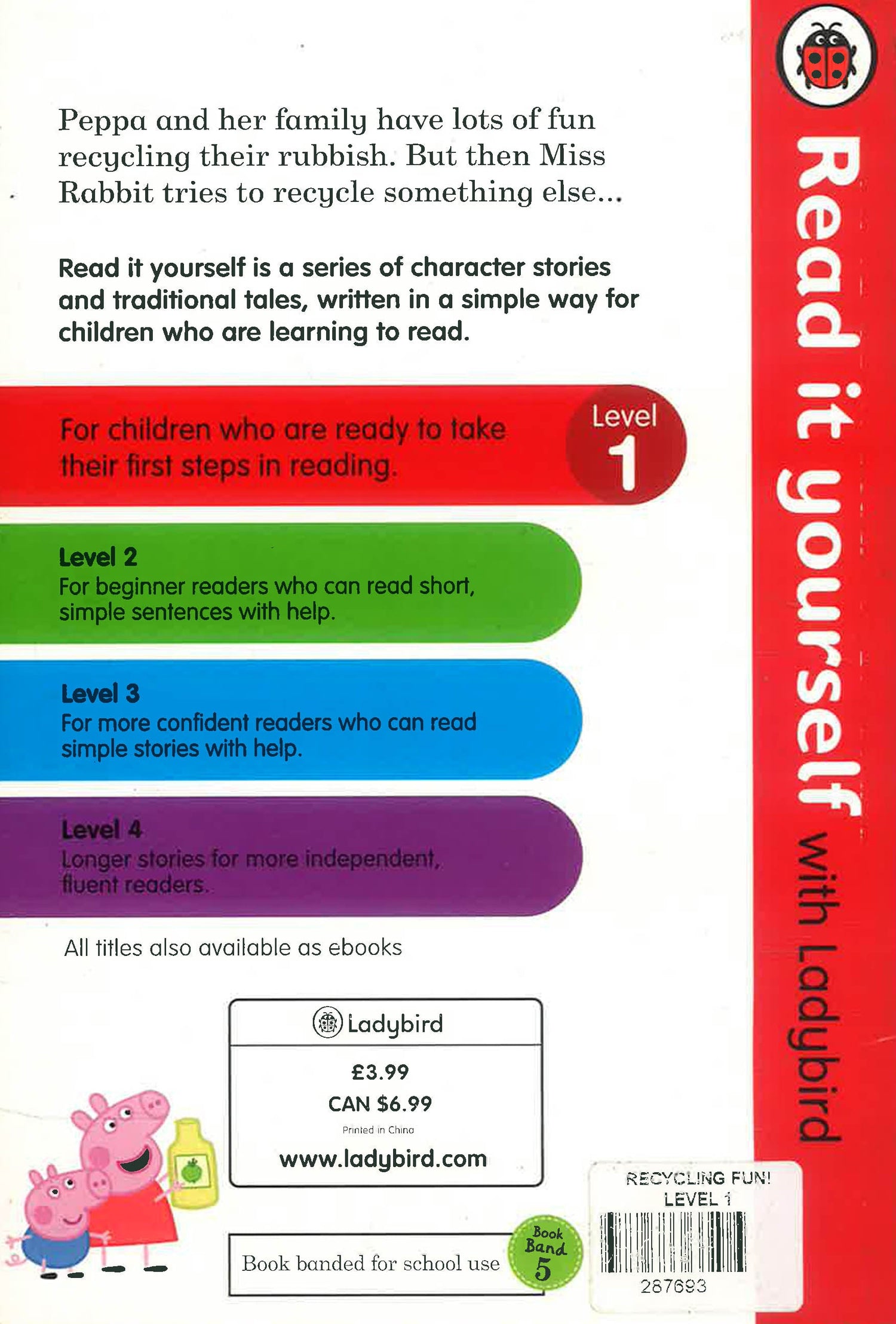 Peppa Pig: Recycling Fun is a Level 1 Read it yourself title, suitable for very early readers who have had some initial reading instruction and are ready to take their first steps in reading real stories. Each story is told very simply, using a small number of frequently repeated words.