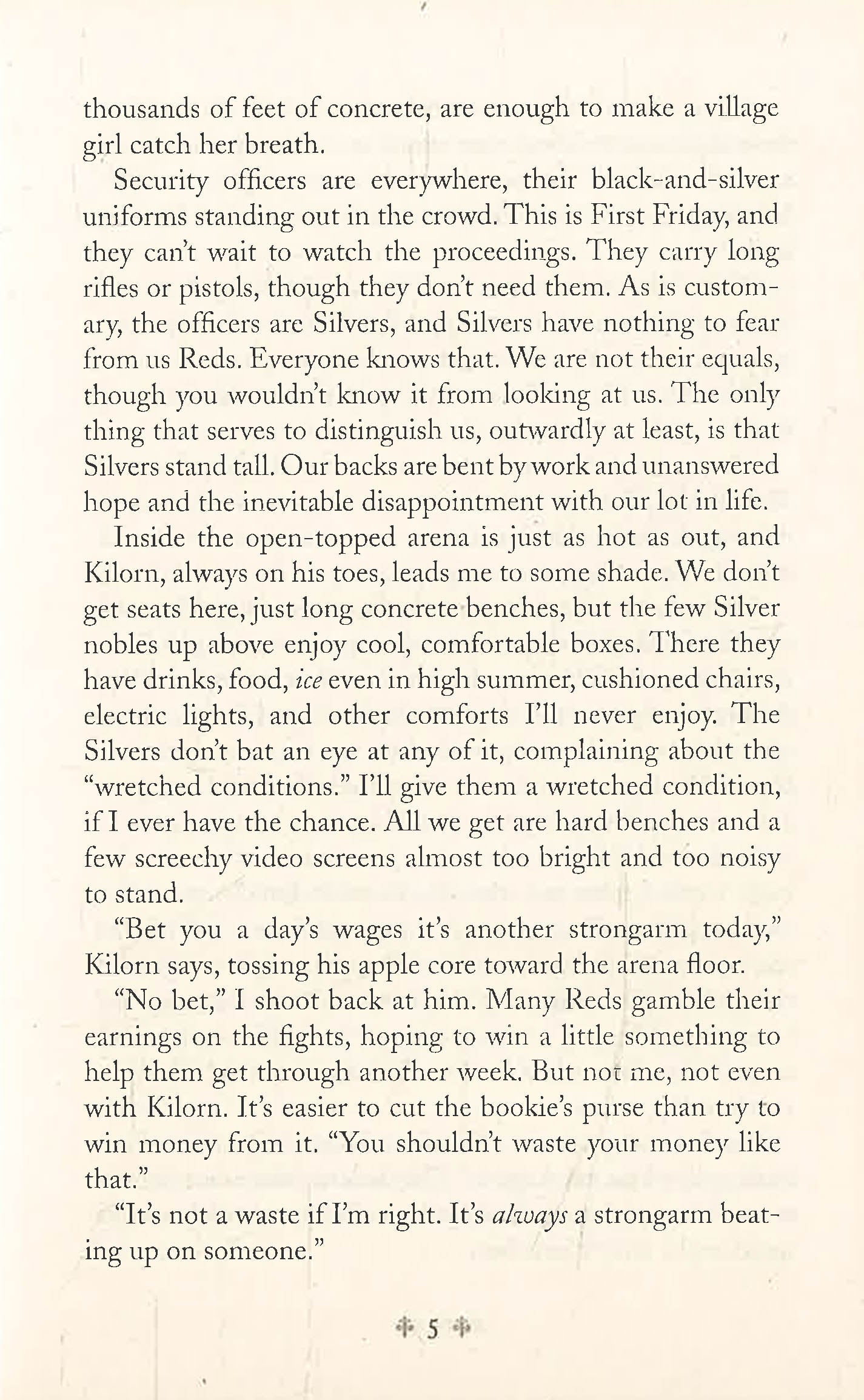 Fearful of Mare's potential, the Silvers hide her in plain view, declaring her a long-lost Silver princess, now engaged to a Silver prince. Despite knowing that one misstep would mean her death, Mare works silently to help the Red Guard, a militant resistance group, and bring down the Silver regime.
