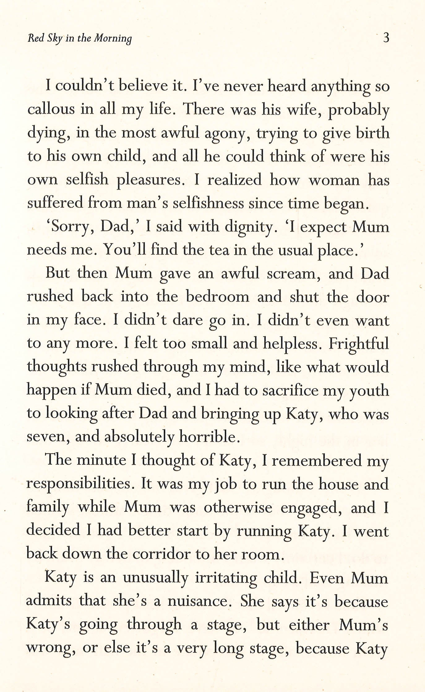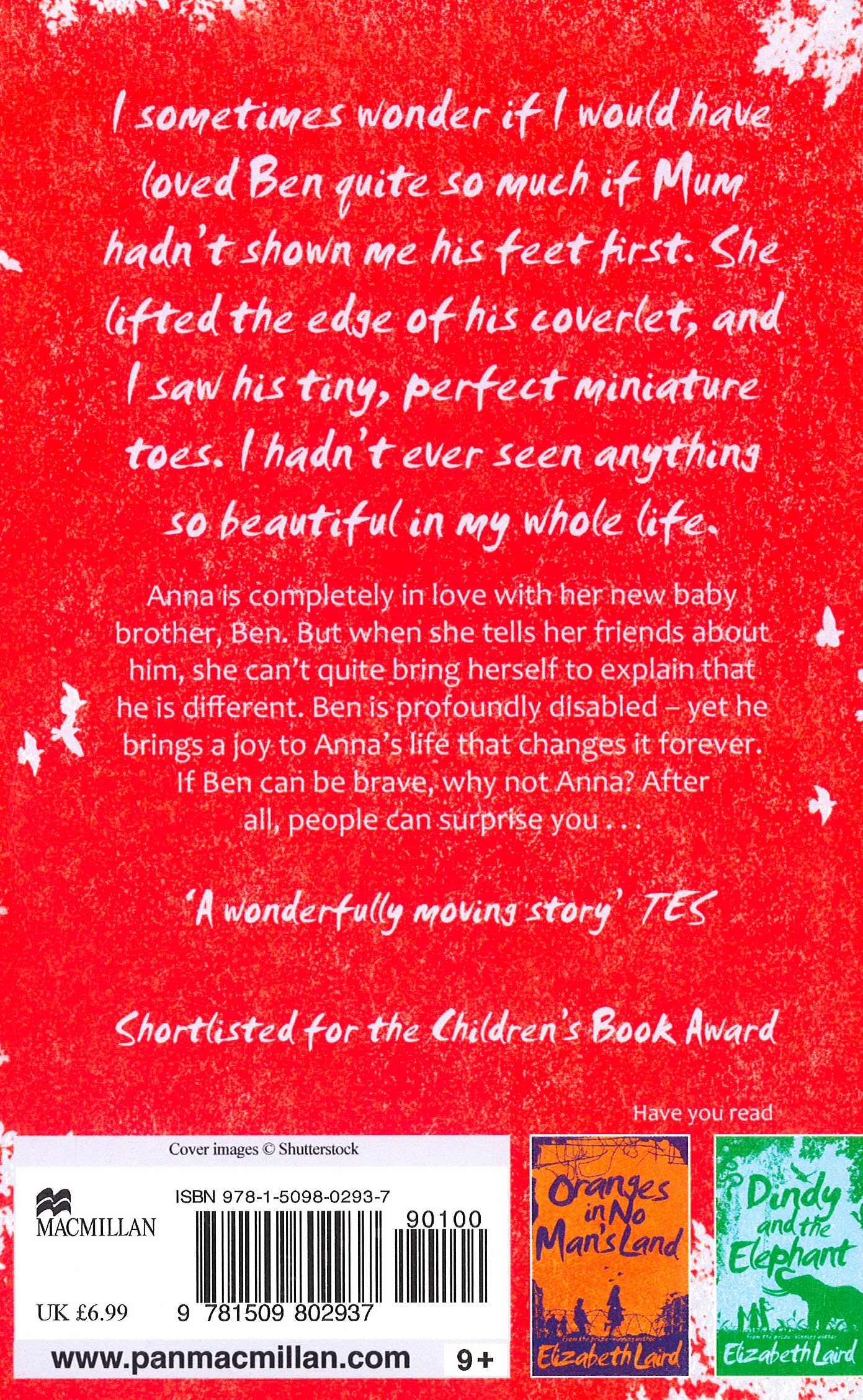 Twelve-year-old Anna is looking forward to the birth of her baby brother. Ben arrives, but is disabled and will never be like other children. Anna loves him with her whole heart, but she finds herself unable to admit the truth of Ben's condition to her school friends. Eventually the truth gets out and leads not to the ridicule Anna expected, but to sympathy and understanding.An emotional and wonderfully written story by Elizabeth Laird, Red Sky in the Morning was Highly Commended for the Carnegie Medal.