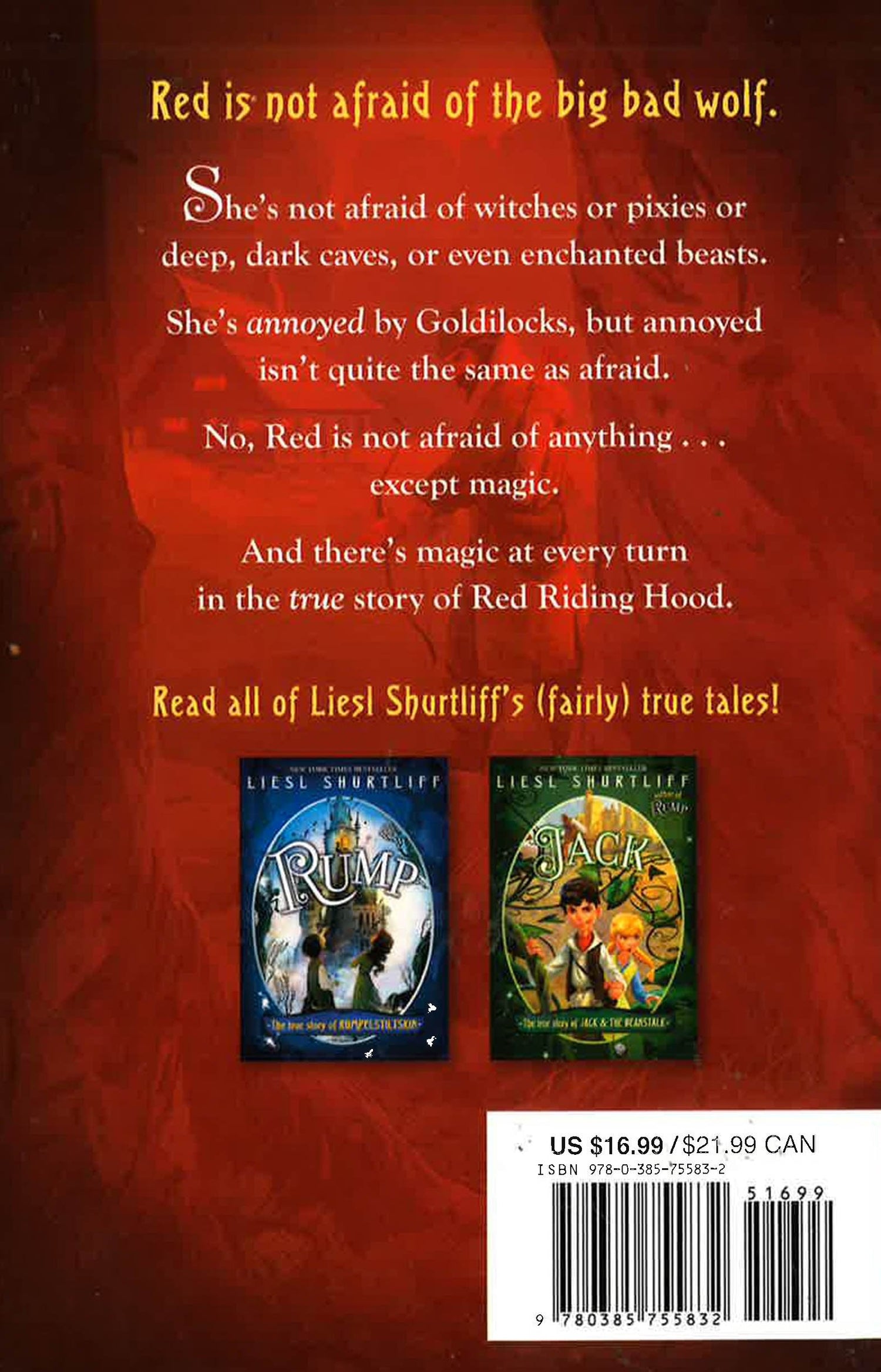 From the New York Times bestselling author of RUMP, comes a spellbinding fairy tale featuring a brave heroine, a wild wolf, plenty of magical misadventures, and more! Red is not afraid of the big bad wolf. She's not afraid of anything . . . except magic. But when Red's granny falls ill, it seems that only magic can save her, and fearless Red is forced to confront her one weakness. With the help of a blond, porridge-sampling nuisance called Goldie, Red goes on a quest to cure Granny. Her journey takes her through dwarves' caverns to a haunted well and a beast's castle. All the while, Red and Goldie are followed by a wolf and a huntsman--two mortal enemies who seek the girls' help to defeat each other. And one of them just might have the magical solution Red is looking for. . . . Liesl Shurtliff weaves a spellbinding tale, shining the spotlight on a beloved character from her award-winning debut, Rump. "Red is the most wonder-filled fairy tale of them all!" -- Chris Grabenstein, New York Times Bestselling author of Escape from Mr. Lemoncello's Library. "Moving and filled with hope . . . the charm of Shurtliff's retelling is how she imbues the storybook tropes with vibrant humanity."--Shelf Awareness, starred review And don't miss Jack: The True Story of Jack and the Beanstalk, "a delightful story of family, perseverance and courage" (Booklist).