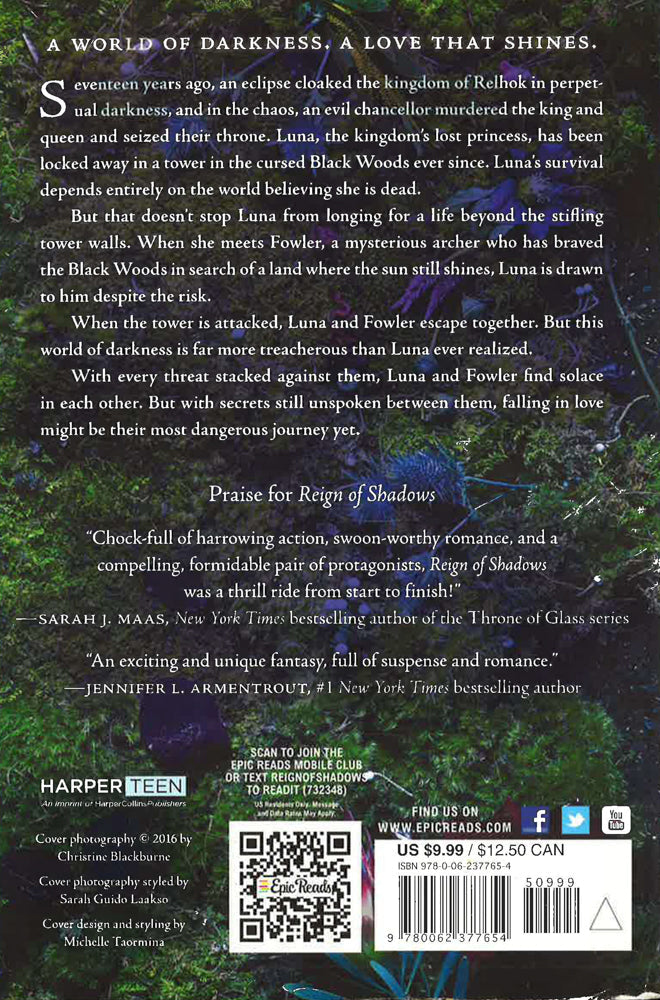 Seventeen years ago, an eclipse cloaked the kingdom of Relhok in perpetual darkness. In the chaos, an evil chancellor murdered the king and queen and seized their throne. Luna, Relhok's lost princess, has been hiding in a tower ever since. Luna's survival depends on the world believing she is dead. But that doesn't stop Luna from wanting more. When she meets Fowler, a mysterious archer braving the woods outside her tower, Luna is drawn to him despite the risk. When the tower is attacked, Luna and Fowler escape together. But this world of darkness is more treacherous than Luna ever realized. With every threat stacked against them, Luna and Fowler find solace in each other. But with secrets still unspoken between them, falling in love might be their most dangerous journey yet.