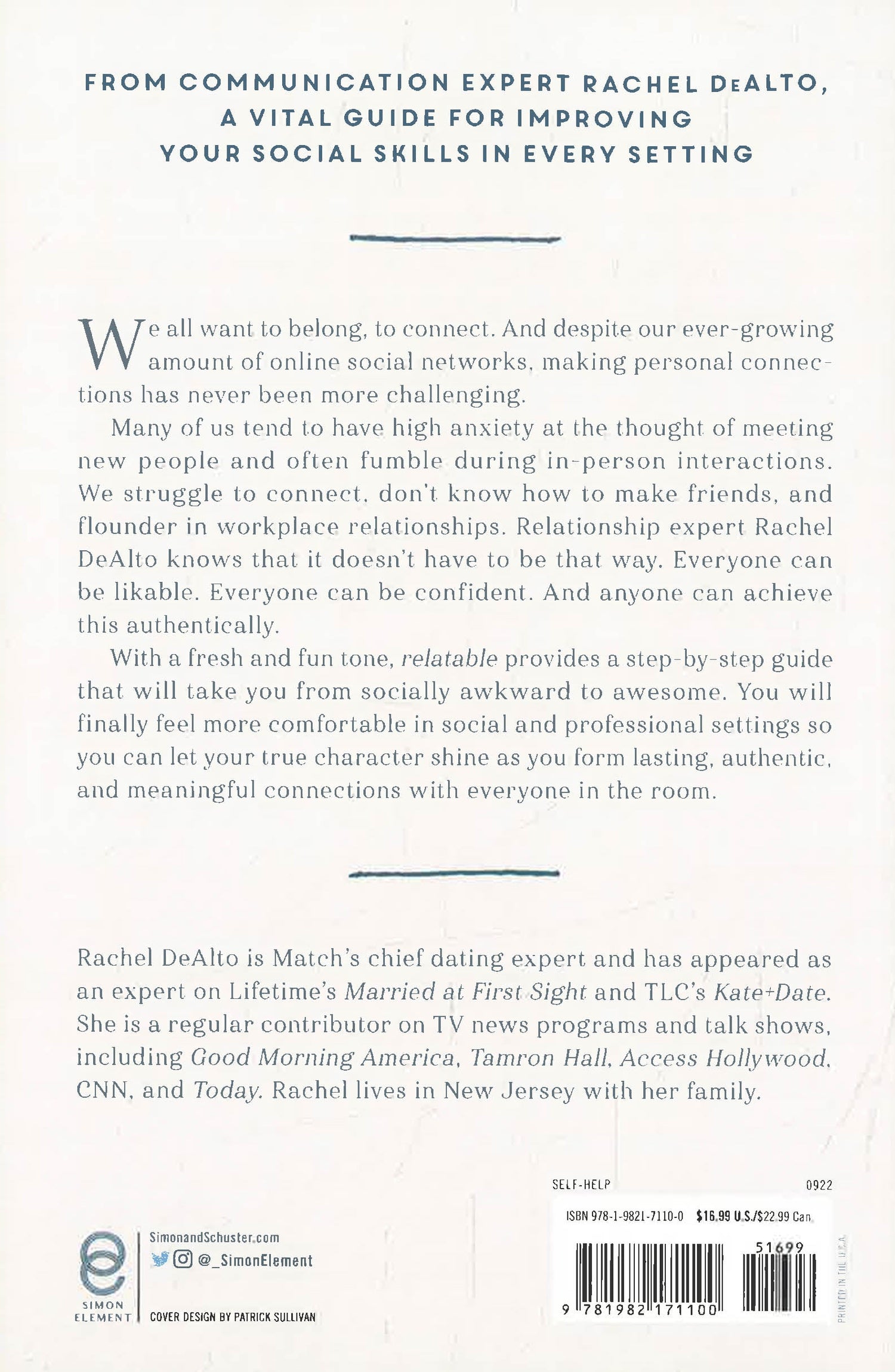 With a fresh, fun, and humorous tone, relatable provides a step-by-step guide that will take you from socially awkward to awesome. You will finally feel more comfortable in social and professional settings so you can let your true character shine as you form lasting, authentic, and meaningful connections with everyone in the room.