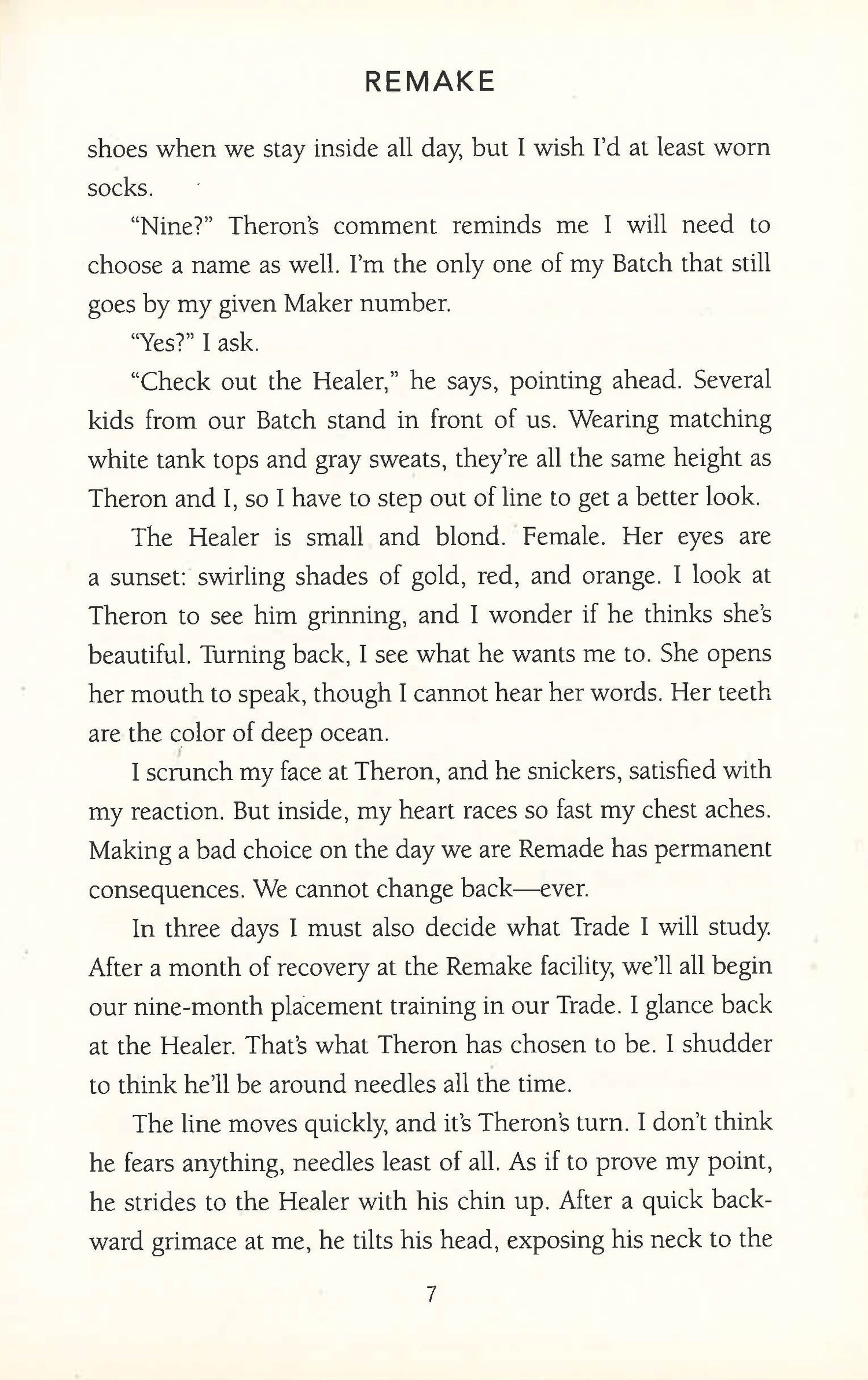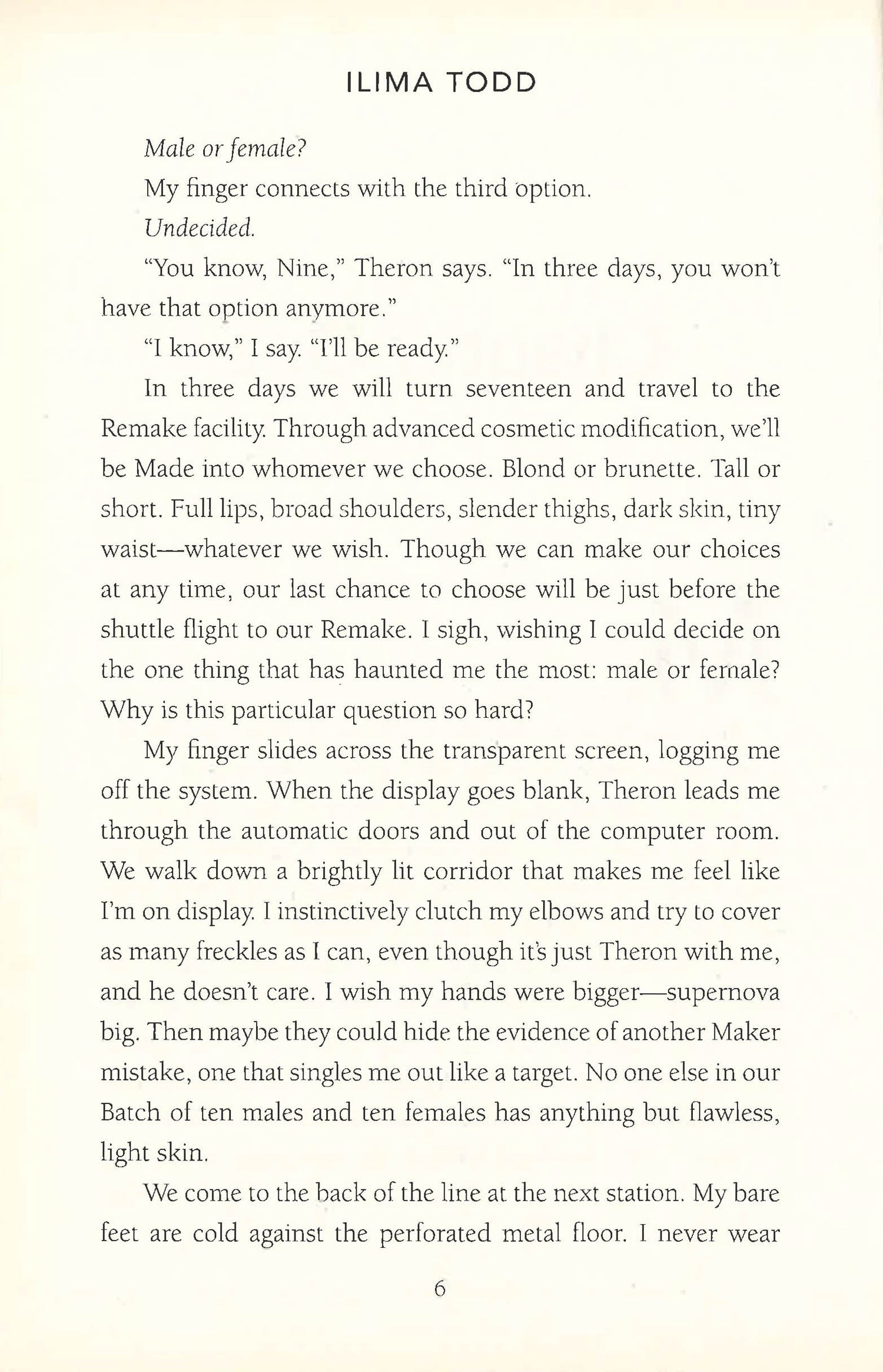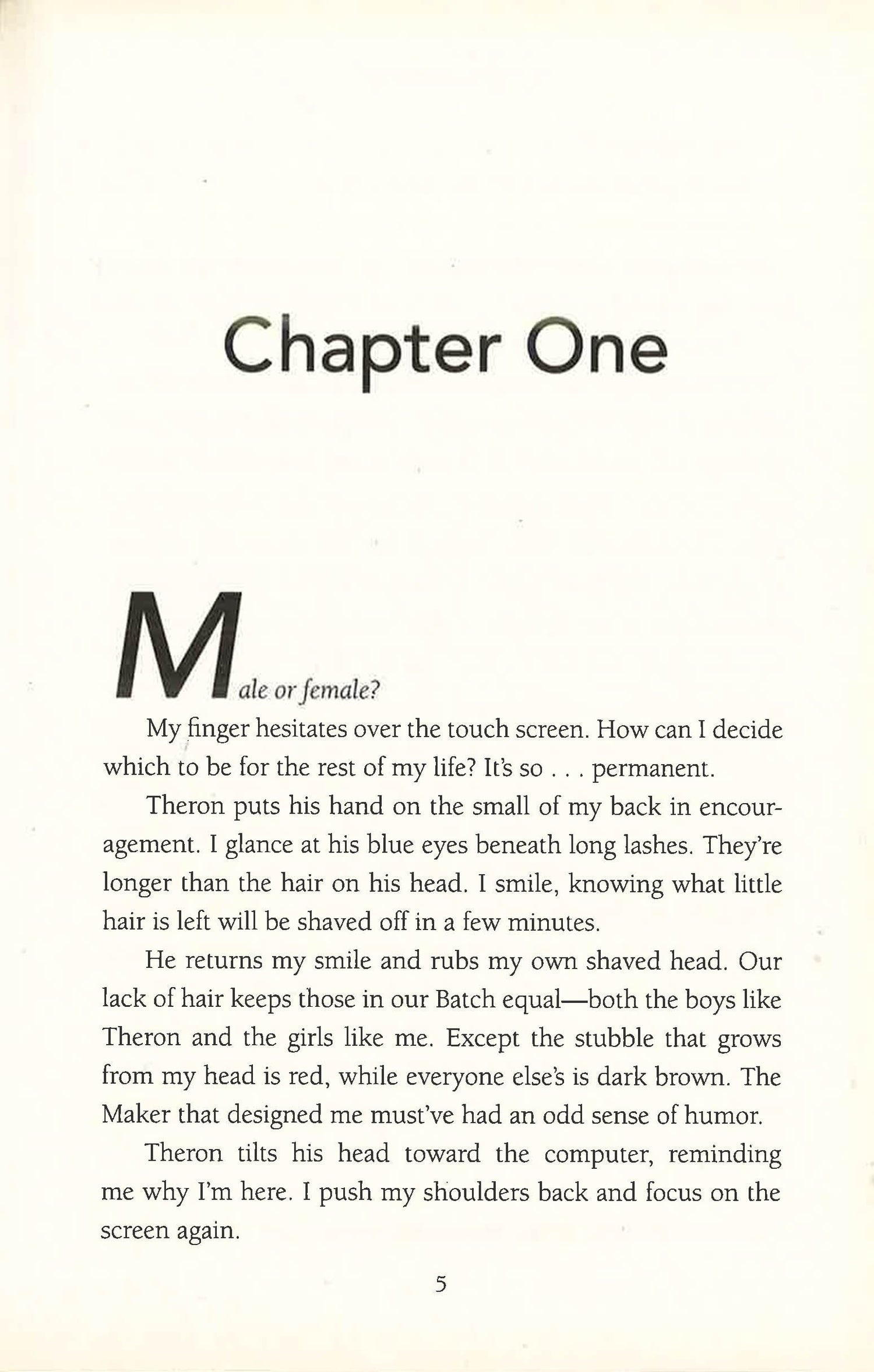 Nine is the ninth female born in her batch of ten females and ten males. But Nine isn't like every other batcher. She is worried about her upcoming Remake Day. That's the day when she and the others in her batch can decide who - and what - they want to be. Everything from hair color and name, from occupation and gender, is theirs to choose. But when something goes terribly wrong, Nine discovers that decisions she thought were hers to make have already been made for her.Pulled between two worlds and two lives, Nine will have to decide what's most important to her. Her decisions will test her courage, her heart, and her beliefs. Who can she trust? Who does she love? And, most important, who will she decide to be?