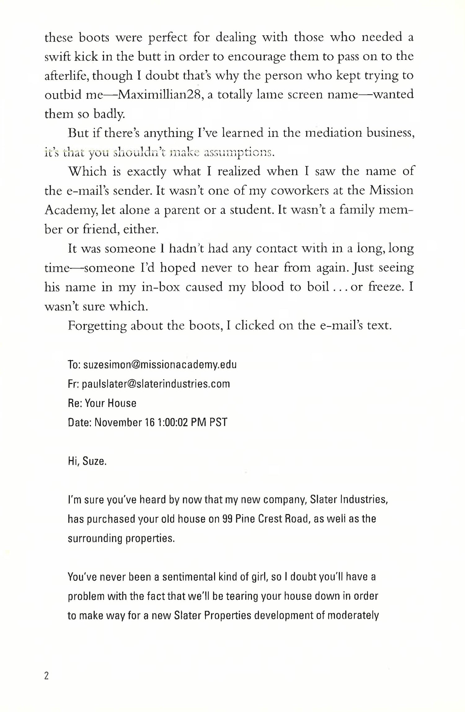 From a sophomore haunted by the murderous specter of a child to ghosts of a very different kind--including Paul Slater, Suze's ex, who shows up to make a bargain Suze is certain must have come from the Devil himself--Suze isn't sure she'll make it through the semester, let alone to her wedding night. Suze is used to striking first and asking questions later. But what happens when ghosts from her past--including one she found nearly impossible to resist--strike first?