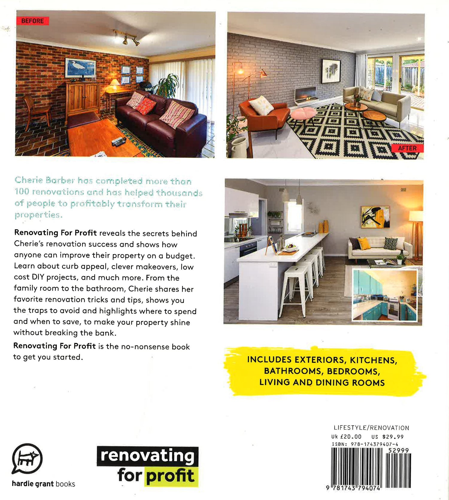 At last a highly illustrated, practical book that renovators will love - Renovating for Profit reveals property expert Cherie Barber's secret methods for renovating property to turn a profit. Covering budgeting, time-saving plans, timelines and successful use of colour and space, Cherie shows you how to avoid all the common mistakes. She uses real-life examples and before-and-after pictures, to explain they key areas you need to address (and those that you can ignore as they won't influence a potential buyer). Cherie's proven, step-by-step approach is shown over 90 renovation projects, featuring all types of homes from flats to houses to cabins.