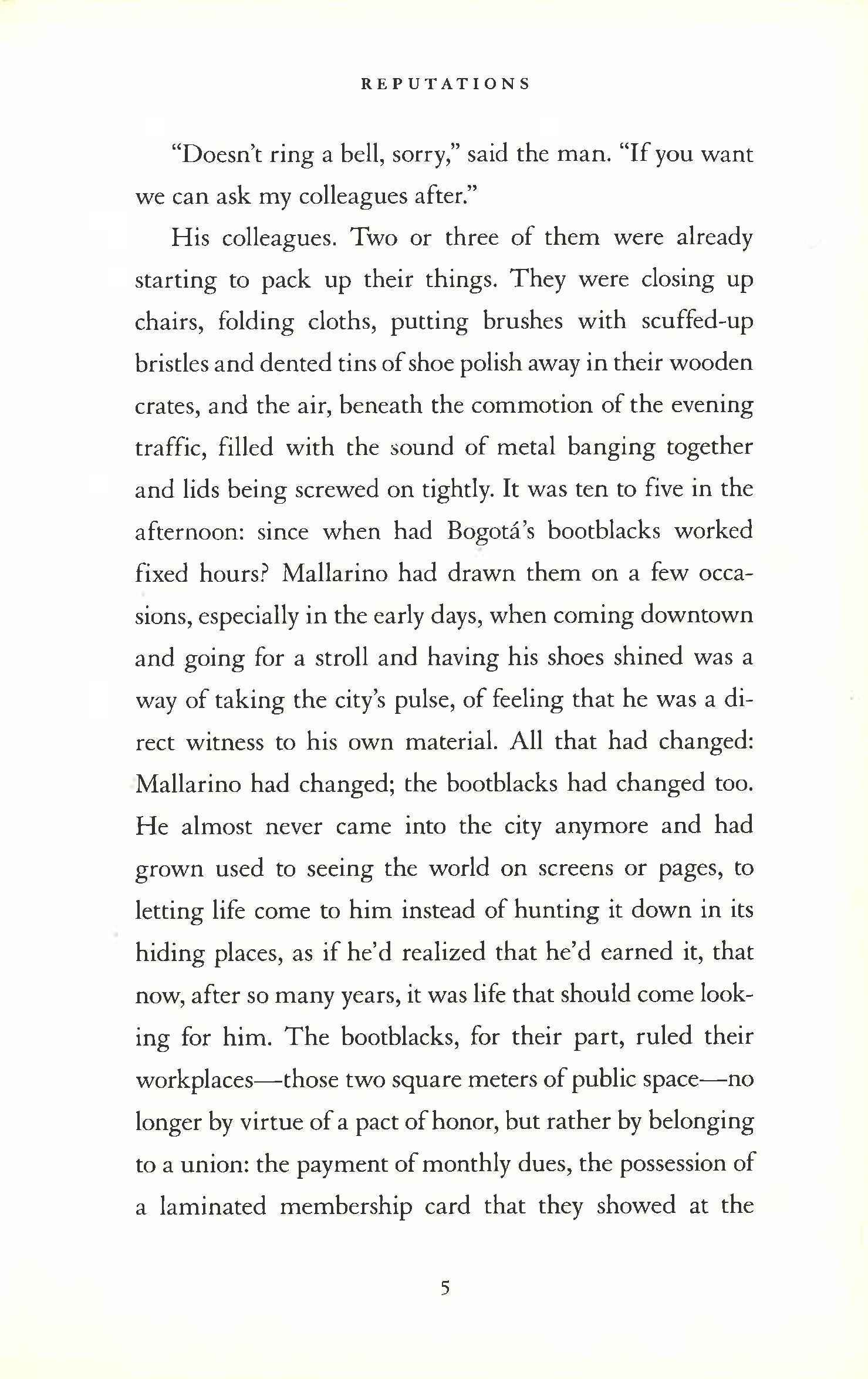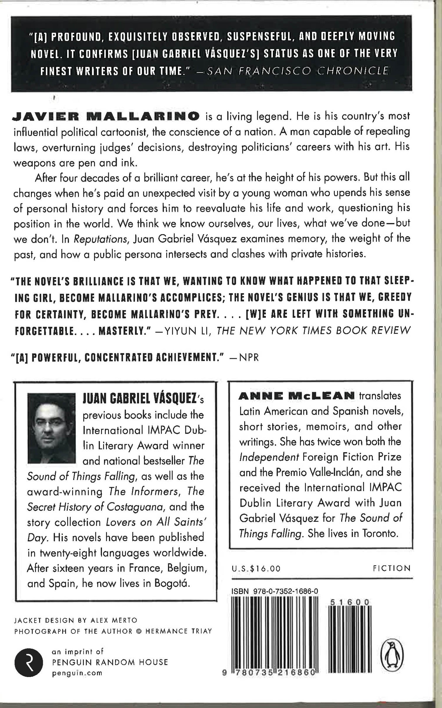 A brilliant novel about the power of politics and personal memory from one of South America's literary stars, the New York Times bestselling author of The Sound of Things Falling. Javier Mallarino is a living legend. He is his country's most influential political cartoonist, the consciousness of a nation. A man capable of repealing laws, overturning judges' decisions, destroying politicians' careers with his art. His weapons are pen and ink. Those in power fear him and pay him homage. After four decades of a brilliant career, he's at the height of his powers. But this all changes when he's paid an unexpected visit from a young woman who upends his sense of personal history and forces him to re-evaluate his life and work, questioning his position in the world. In Reputations, Juan Gabriel Vásquez examines the weight of the past, how a public persona intersects with private histories, and the burdens and surprises of memory. In this intimate novel that recalls authors like Coetzee and Ian McEwan, Vásquez plumbs universal experiences to create a masterful story, one that reverberates long after you turn the final page. Named a Best Book of the Year by the New York Times, Newsweek, the Guardian, and Kirkus