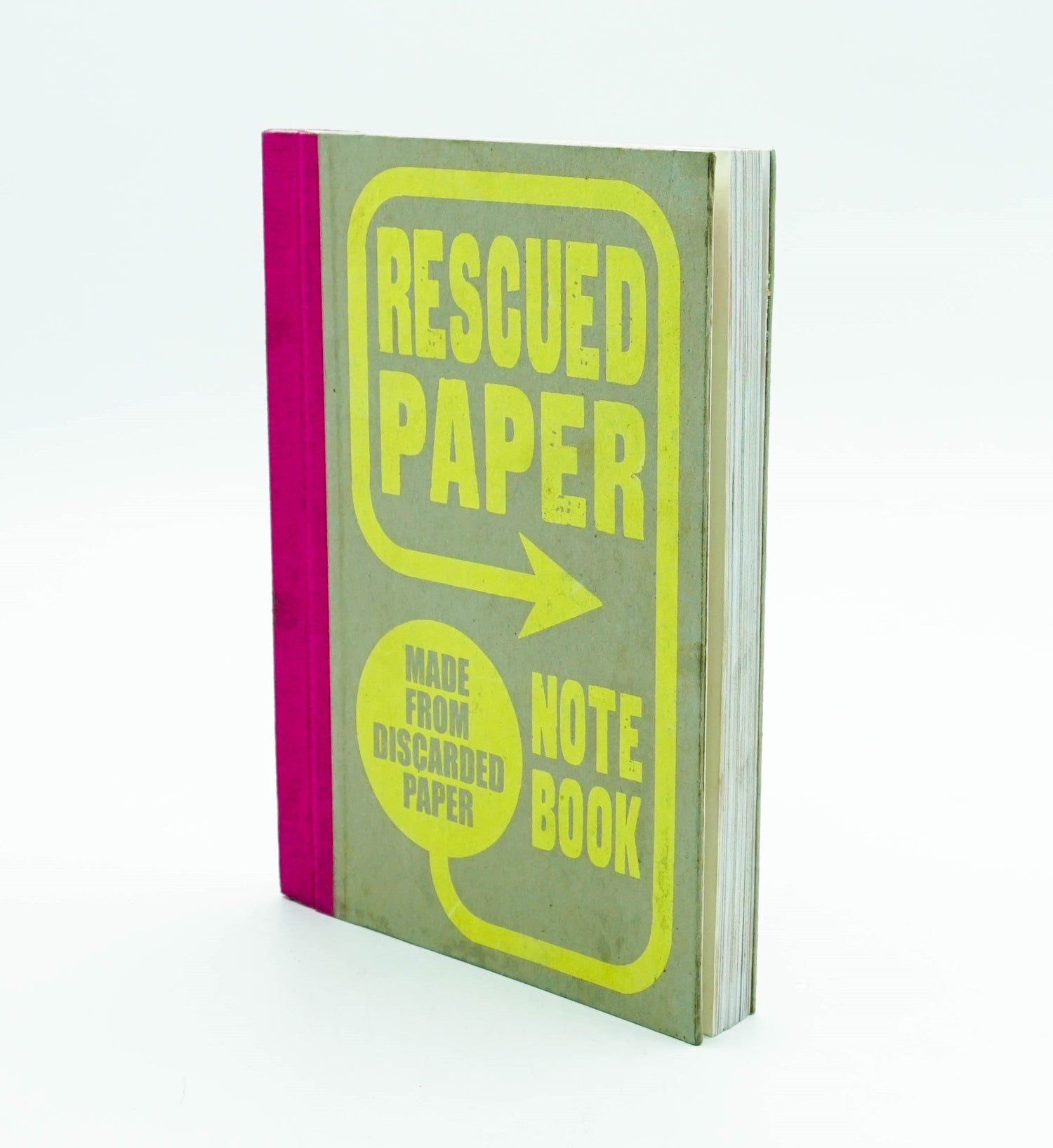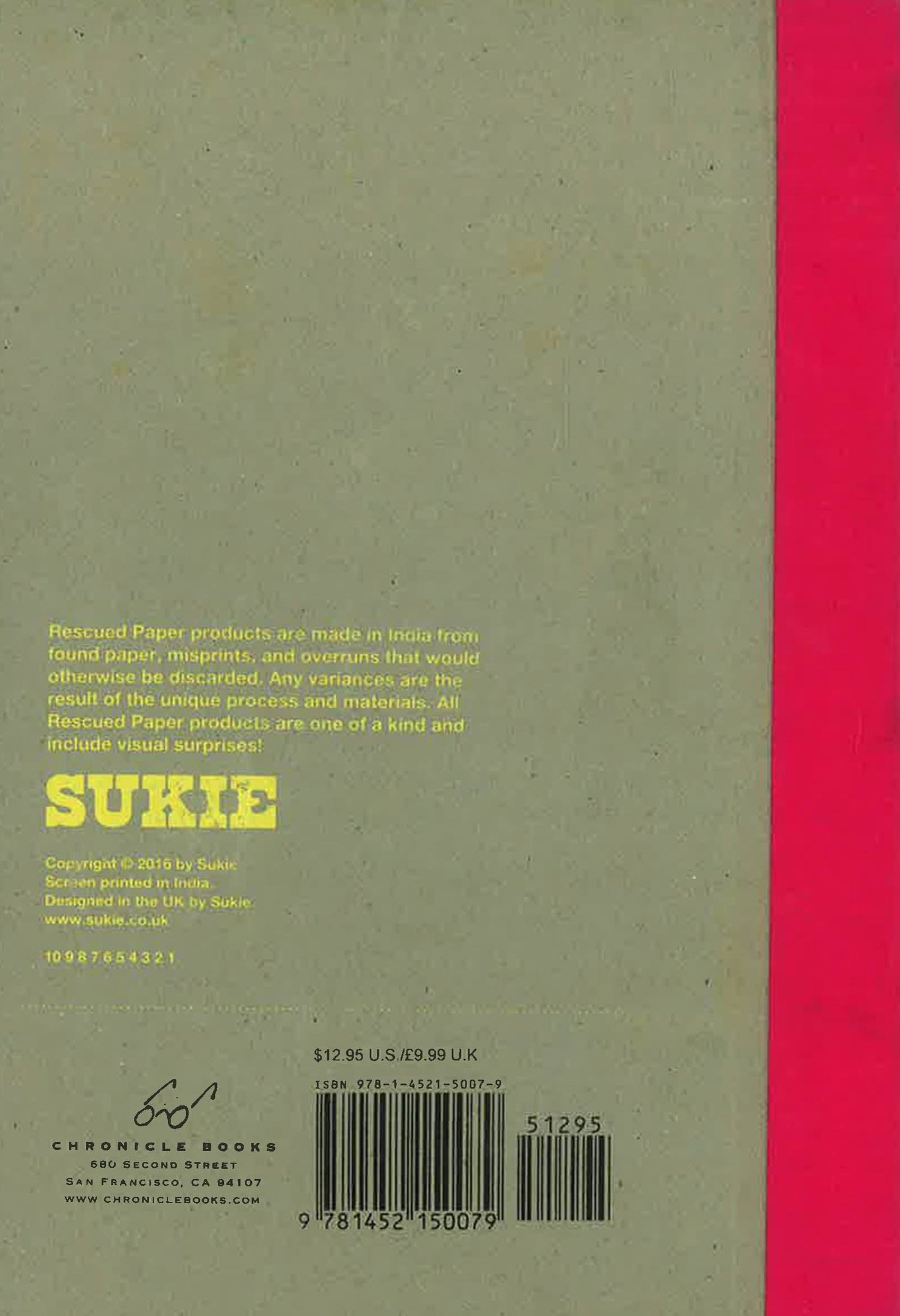 This hardcover notebook features a silk-screened cover, cloth spine and 90 pages of rescued paper within. The sheets are folded and bound so that the blank sides face out for writing, while the previously printed sides face in, offering a peekaboo reveal. RESCUED PAPER products are made from paper stocks that would otherwise be discarded. No paper is pulped in this line. Found in Old Delhi's Paper Market as well as among misprints and overruns from manufacturers across India, the rescued paper is sorted, folded, and bound with thread and silkscreened covers. Designed by SUKIE, the acclaimed UK-based studio of Darrell and Julia Gibbs.