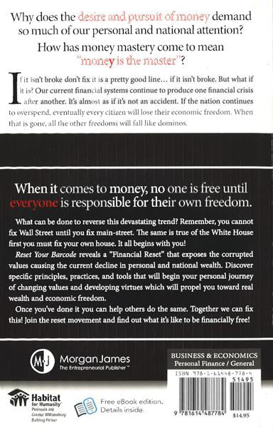 We all know that money isn't everything, but I challenge you to identify three aspects of your life that are not affected by it. Why is it that the desire and pursuit of money demands so much of our personal and national time and attention? How is it that money mastery has come to mean money is the master? "If it isn't broke, don't fix it" is a pretty good line, if it isn't broke. But what if it is? Our current system continues to produce one financial crisis after another. It's almost as if it is not an accident. If the nation continues to overspend, eventually every citizen will lose their economic freedom. When that is gone, all the other freedoms will fall like dominos. When it comes to money, no one is truly free until everyone is free. What can be done to reverse this devastating trend? Remember, you cannot fix Wall Street until you fix Main Street. The same is true of the White House. First, you must fix your own house. It all begins with you! Reset Your Barcode reveals hidden treasures of knowledge that expose the corrupted values that are causing the current decline in personal and national wealth. You will discover specific principles, practices, and tools that will begin your personal journey of changing values and develop virtues that will propel you toward real wealth and economic freedom. Once you've done it you can help others do the same. Together we can fix this! Join the reset movement and find out what it's like to be financially free!
