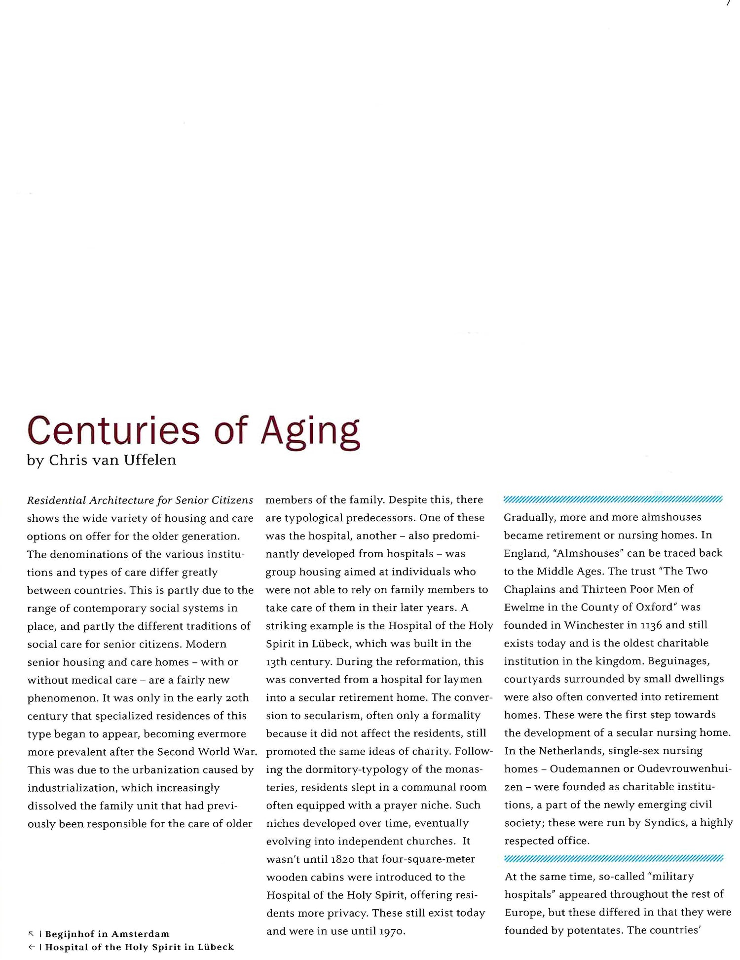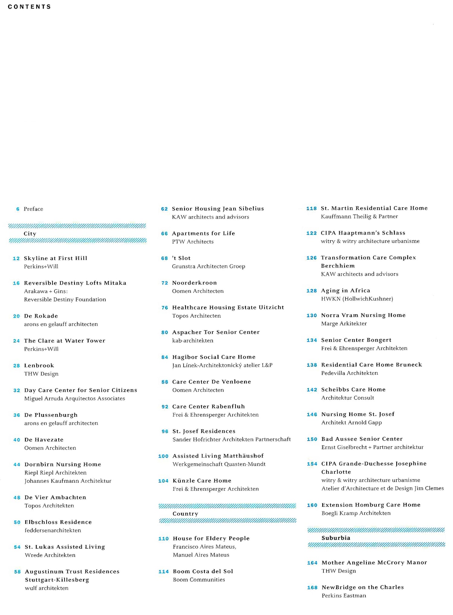 Citizens in retirement age are becoming an ever greater but also more active part of society. Along with this socio-cultural shift a new emphasis on living quality and atmosphere is the home emerges - instead of simply functionality and cleanliness. In contrast to the general idea of "retirement home" the residences of today are superbly designed and furnished service domiciles. Care and medical support are of course part of the extensive offer. Common areas and services can, but must not be used. A winning design is a powerful argument in the competition among the providers. The buildings selected for this book are tailored to the special, very individual needs of today's senior citizens.