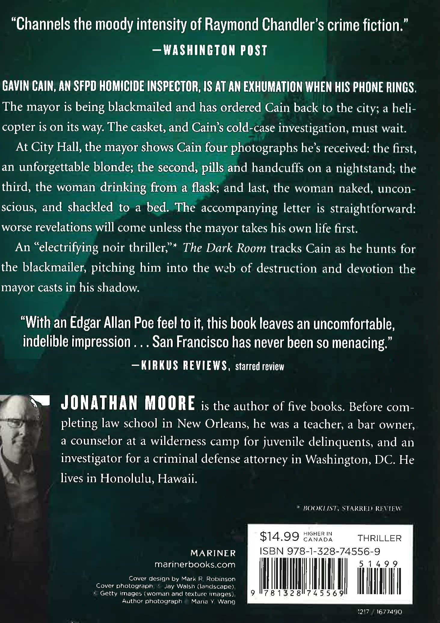 If you like Michael Connelly's novels, you will gobble up Jonathan Moore's The Dark Room. --James Patterson "Channels the moody intensity of Raymond Chandler's crime fiction."--Washington Post Gavin Cain, an SFPD homicide inspector, is at an exhumation when his phone rings. The mayor is being blackmailed and has ordered Cain back to the city; a helicopter is on its way. The casket, and Cain's cold-case investigation, must wait. At City Hall, the mayor shows Cain four photographs he's received: the first, an unforgettable blonde; the second, pills and handcuffs on a nightstand; the third, the woman drinking from a flask; and last, the woman naked, unconscious, and shackled to a bed. The accompanying letter is straightforward: worse revelations will come unless the mayor takes his own life first. An "electrifying noir thriller,"* The Dark Room tracks Cain as he hunts for the blackmailer, pitching him into the web of destruction and devotion the mayor casts in his shadow. "With an Edgar Allan Poe feel to it, this book leaves an uncomfortable, indelible impression . . . San Francisco has never been so menacing."--Kirkus, starred review *Booklist, starred review