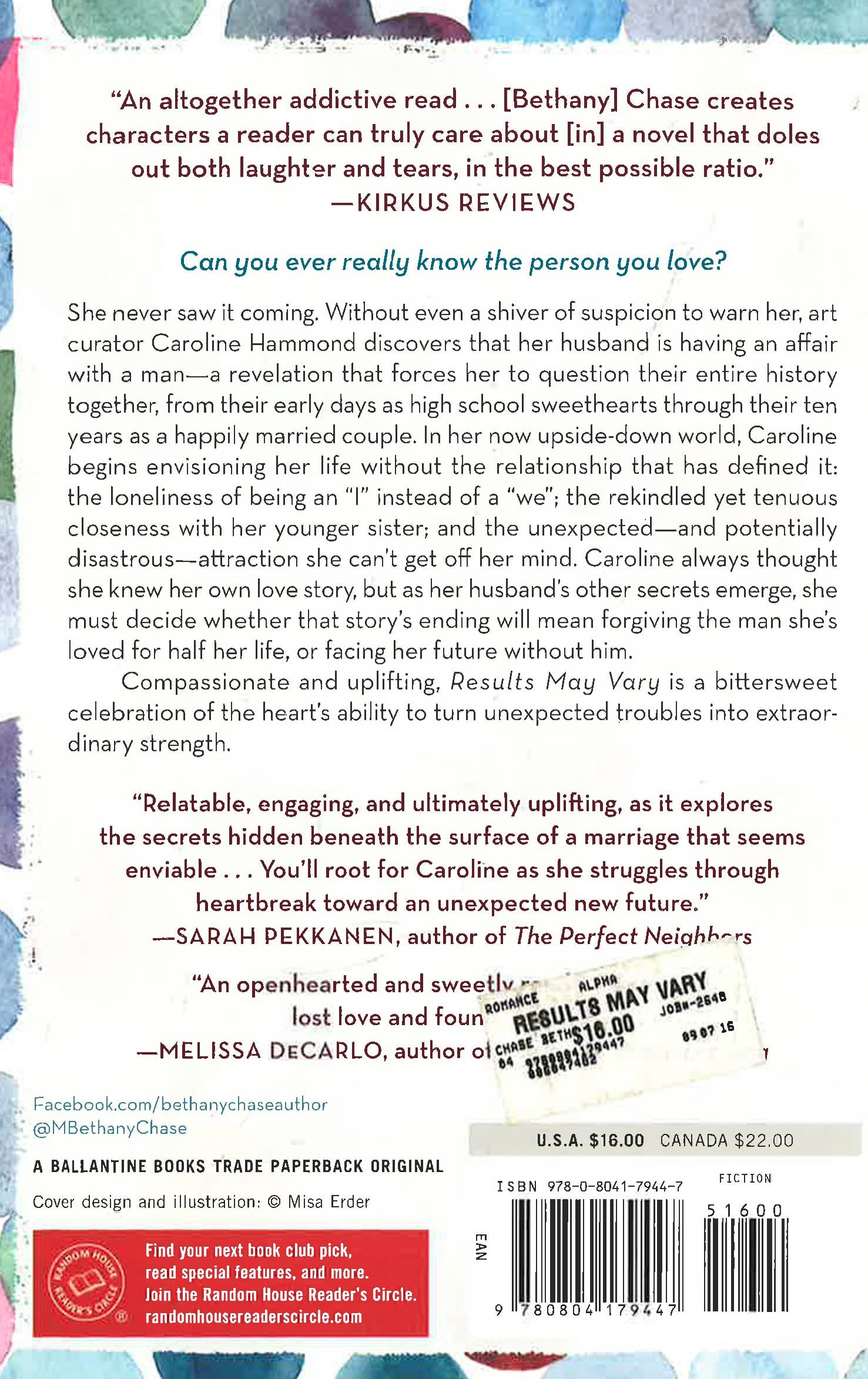 Can you ever really know the person you love? She never saw it coming. Without even a shiver of suspicion to warn her, art curator Caroline Hammond discovers that her husband is having an affair with a man--a revelation that forces her to question their entire history together, from their early days as high school sweethearts through their ten years as a happily married couple. In her now upside-down world, Caroline begins envisioning her life without the relationship that has defined it: the loneliness of being an "I" instead of a "we"; the rekindled yet tenuous closeness with her younger sister; and the unexpected--and potentially disastrous--attraction she can't get off her mind. Caroline always thought she knew her own love story, but as her husband's other secrets emerge, she must decide whether that story's ending will mean forgiving the man she's loved for half her life, or facing her future without him. Compassionate and uplifting, Results May Vary is a bittersweet celebration of the heart's ability to turn unexpected troubles into extraordinary strength. Praise for Results May Vary "Chase has written an incredibly charming novel about shifting from being completed by a man to becoming a whole woman. Witnessing Caro's growth is a pleasure."--Library Journal "Bethany Chase writes with a realism of expression that allows readers to empathize and appreciate the characters' personalities and frustrations. The push and pull written into interpersonal dynamics between characters feels true to life, and is best seen in Caroline's relationship with her sister. The surprises keep readers alert and the tempo of the novel holds their attention until the very last page."--RT Book Reviews "This latest novel from Chase will appeal to anyone who has ever looked up to realize they define themselves by those surrounding them. Caroline's exploration of self-discovery is a familiar one, yet Chase has a way with phrasing and a thoughtful approach that pushes this one notch above the others. . . . A good fit for fans of Emily Giffin and Kristin Hannah."--Booklist "An altogether addictive read . . . Chase creates characters a reader can truly care about [in] a novel that doles out both laughter and tears."--Kirkus Reviews "Results May Vary is an openhearted and sweetly rendered story of lost love and found strength."--Melissa DeCarlo, author of The Art of Crash Landing "Relatable, engaging, and ultimately uplifting, as it explores the secrets hidden beneath the surface of a marriage that seems enviable . . . You'll root for Caroline as she struggles through heartbreak toward an unexpected new future."--Sarah Pekkanen, author of The Perfect Neighbors