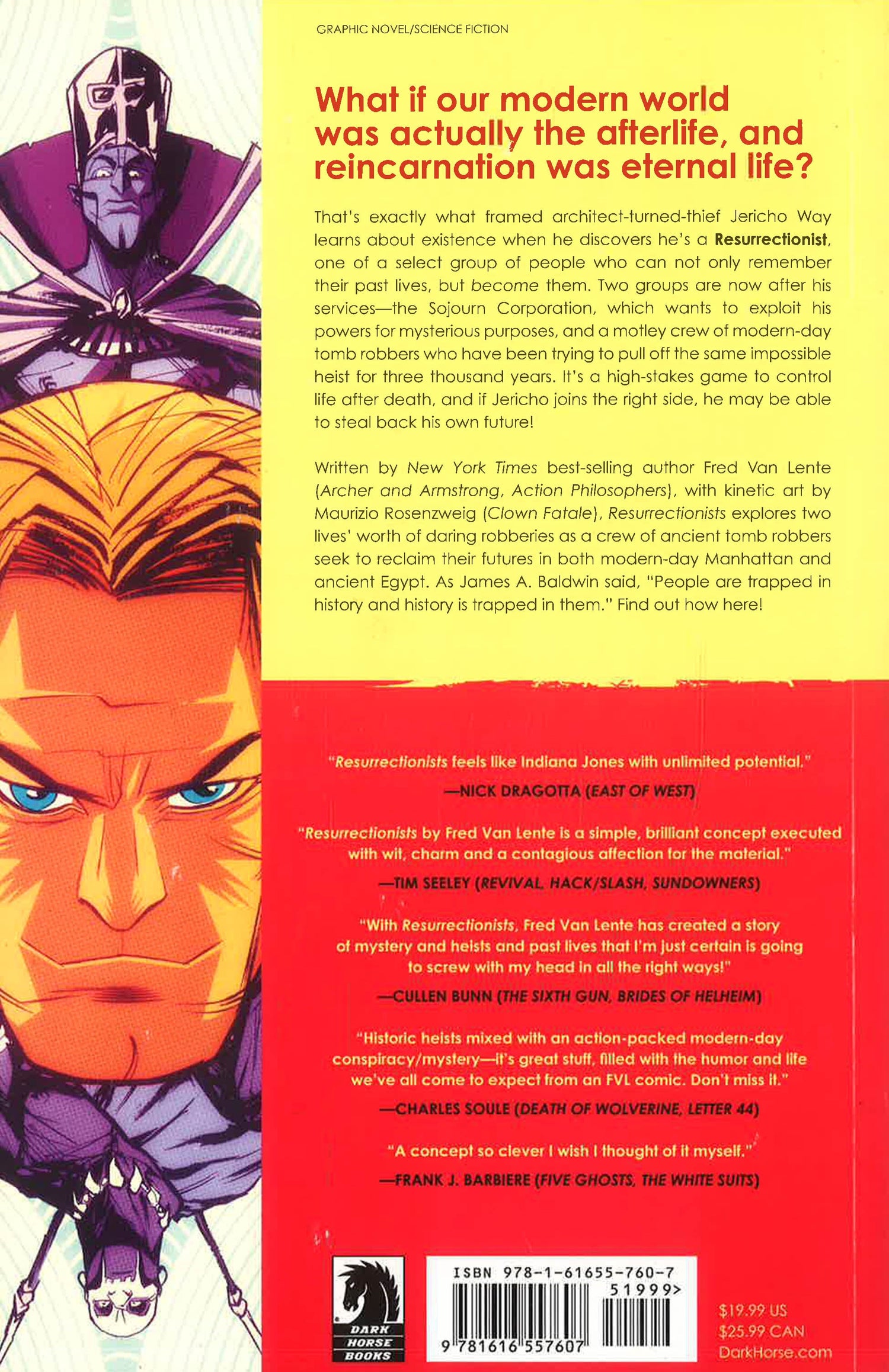 Resurrectionists are a select group of people who can not only remember their past lives, but also become them. Framed architect-turned-thief Jericho Way and his crew of modern-day tomb robbers aren't born knowing they've been trying to pull off the same heist for three millennia. First, they have to wake up. But with enlightenment comes grave danger--the eternally antagonistic Sojourn Corporation is now hot on their heels!