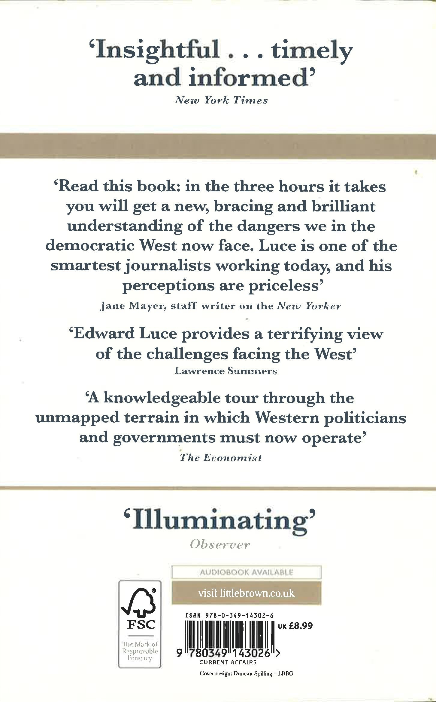 A panorama of the unravelling world order as riveting as any beach read' New Yorker'Read this book: in the three hours it takes you will get a new, bracing and brilliant understanding of the dangers we in the democratic West now face. Luce is one of the smartest journalists working today, and his perceptions are priceless' Jane Mayer, staff writer on the New Yorker'No one was more prescient about the economic malaise and popular resentment that has hit the United States than Ed Luce in his previous book, Time to Start Thinking. His new book, Retreat of Western Liberalism, broadens that picture to cover the Western world. It is a must read for anyone trying to make sense of the waves of populism and nationalism we face today' Liaquat AhamedIn his widely acclaimed book Time to Start Thinking, Financial Times columnist and commentator Edward Luce charted the course of American economic and geopolitical decline, proving to be a prescient voice on our current social and political turmoil.In The Retreat of Western Liberalism, Luce makes a larger statement about the weakening of western hegemony and the crisis of democratic liberalism - of which Donald Trump and his European counterparts are not the cause, but a symptom. Luce argues that we are on a menacing trajectory brought about by ignorance of what it took to build the West, arrogance towards society's losers, and complacency about our system's durability - attitudes that have been emerging since the fall of the Berlin Wall, treated by the West as an absolute triumph over the East. We cannot move forward without a clear diagnosis of what has gone wrong. Luce contrasts Western democratic and economic ideals, which rest on an assumption of linear progress, with more cyclical views of economic strength - symbolized by the nineteenth-century fall and present-day rise of the Chinese and Indian economies - and with the dawn of a new multipolar age.Combining on-the-ground reporting with intelligent synthesis of the vast literature already available, Luce offers a detailed projection of the consequences of the Trump administration and a forward-thinking analysis of what those who believe in enlightenment values must do to defend them from the multiple onslaughts they face in the coming years.