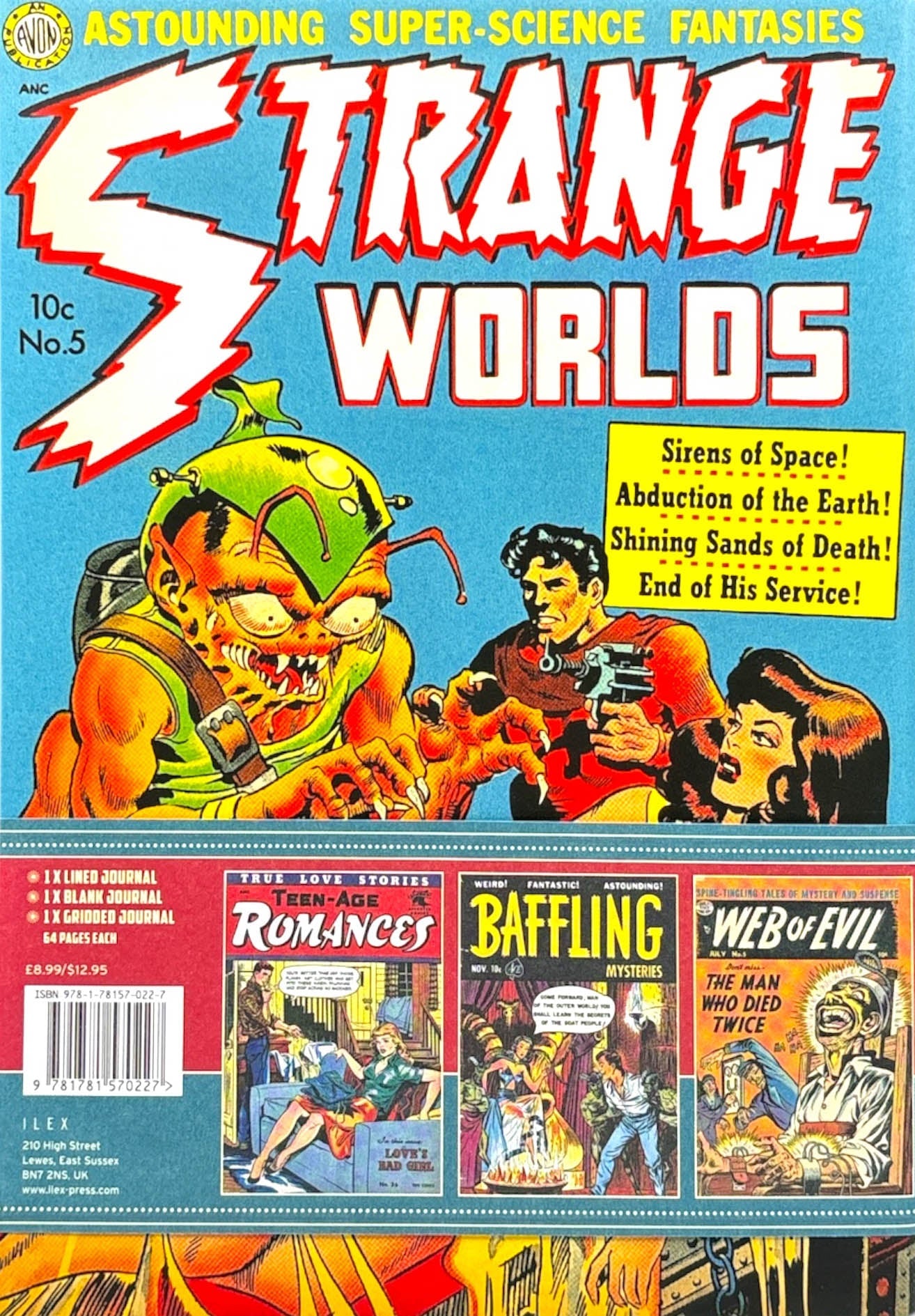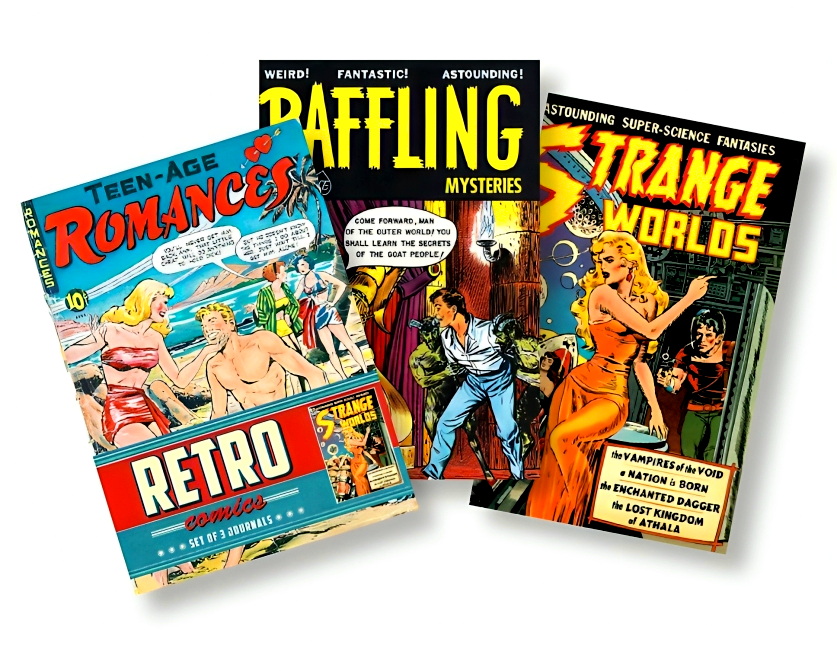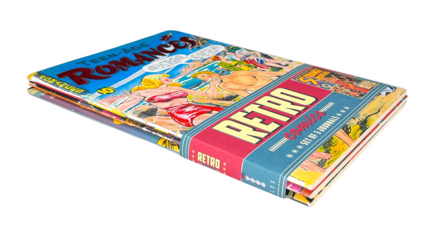 This keenly priced pack of three vintage journals reproduces classic comics covers from the 1950s, including Teen-Age Romances, Strange Worlds, Baffling Mysteries, and Web of Evil! Inside every journal are sample comic strips such as Sirens of Space!, and each one is either gridded, lined, or blank. Fun and funky, this unique journal pack is sure to raise a smile!