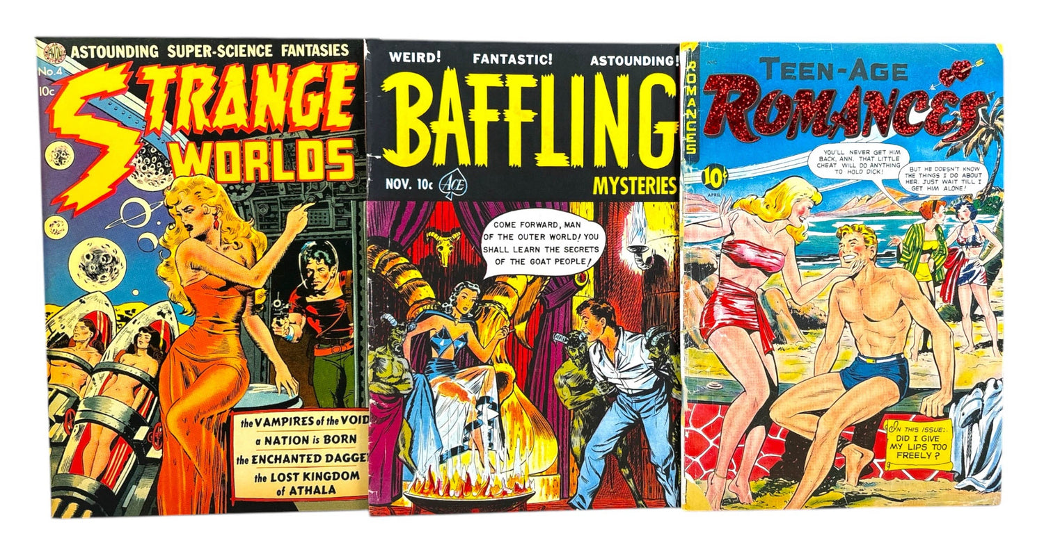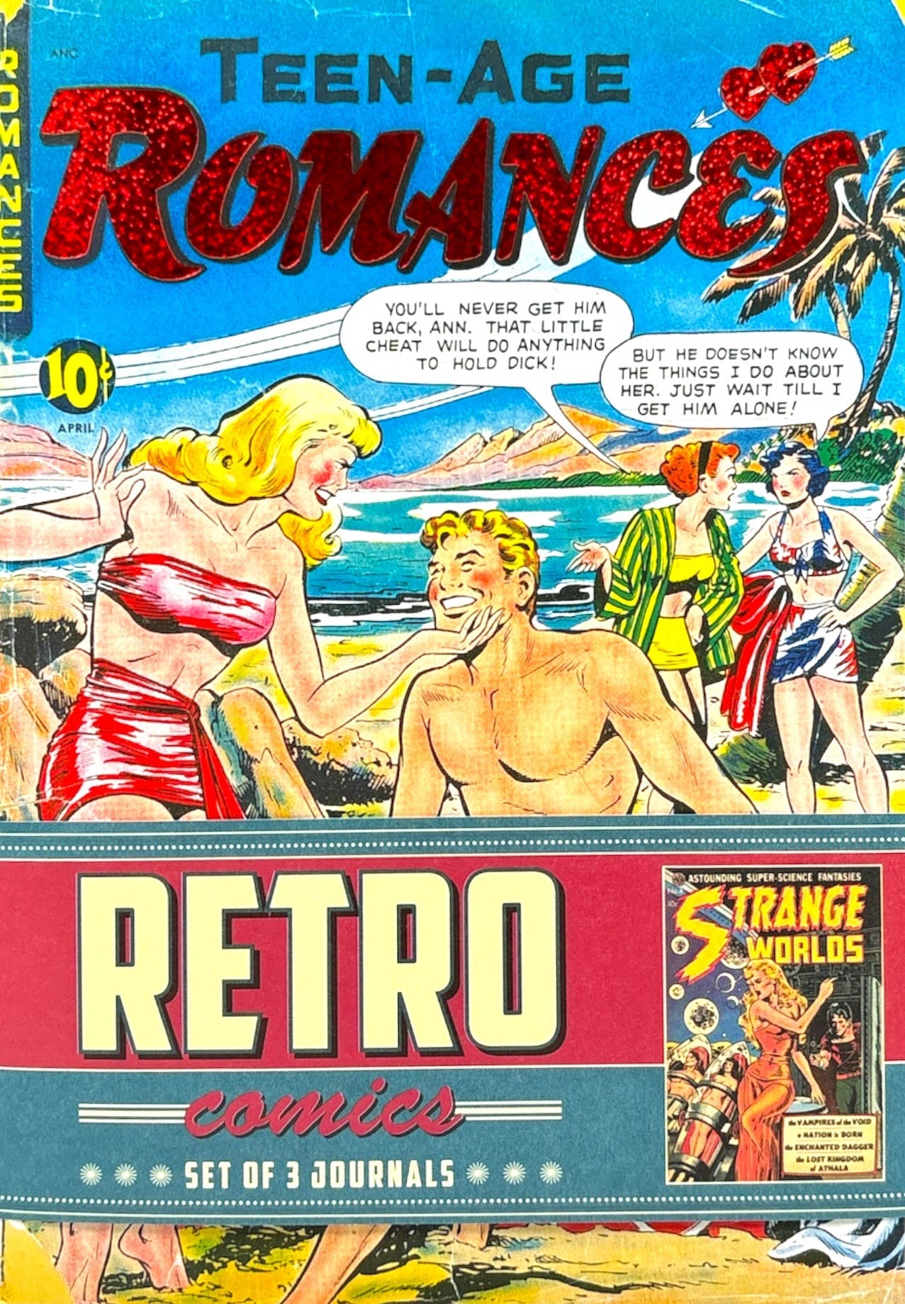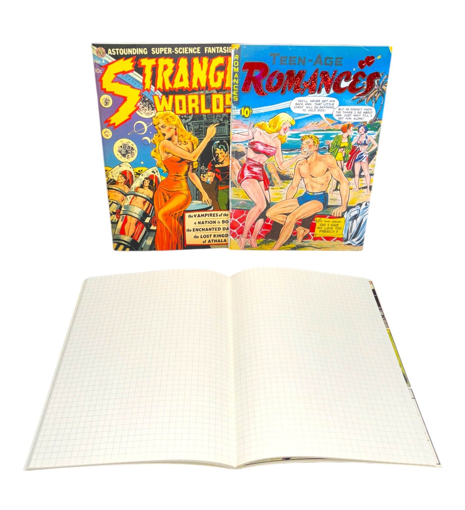 This keenly priced pack of three vintage journals reproduces classic comics covers from the 1950s, including Teen-Age Romances, Strange Worlds, Baffling Mysteries, and Web of Evil! Inside every journal are sample comic strips such as Sirens of Space!, and each one is either gridded, lined, or blank. Fun and funky, this unique journal pack is sure to raise a smile!
