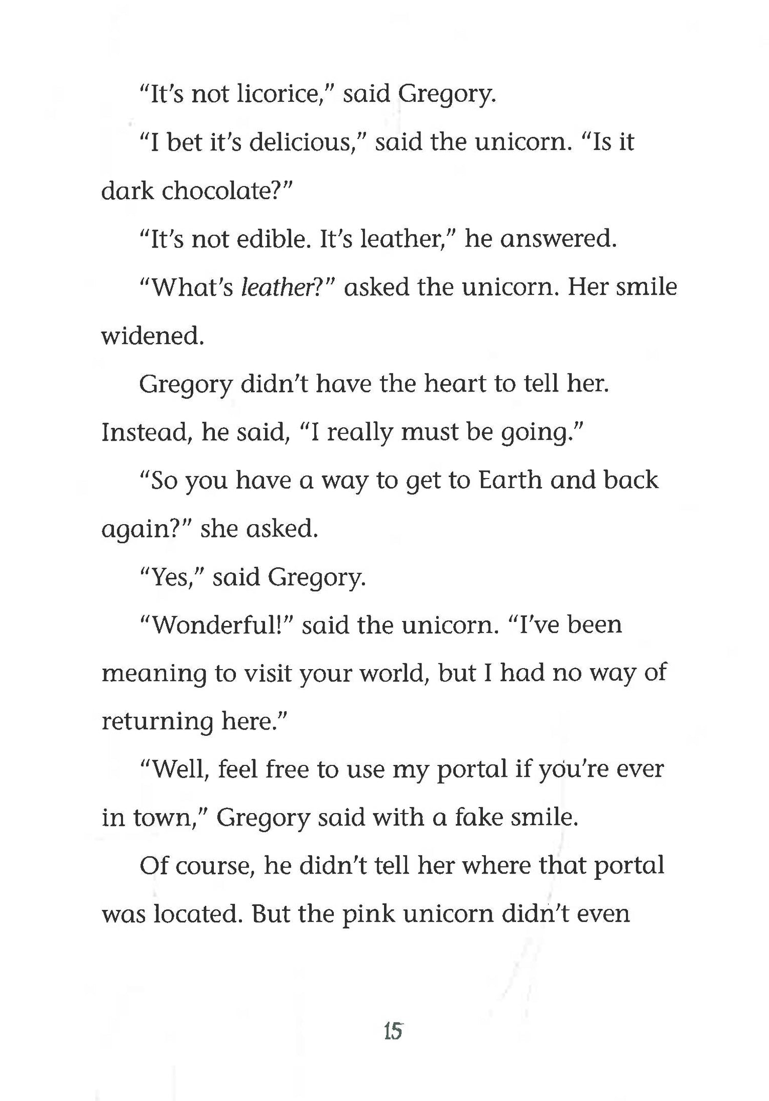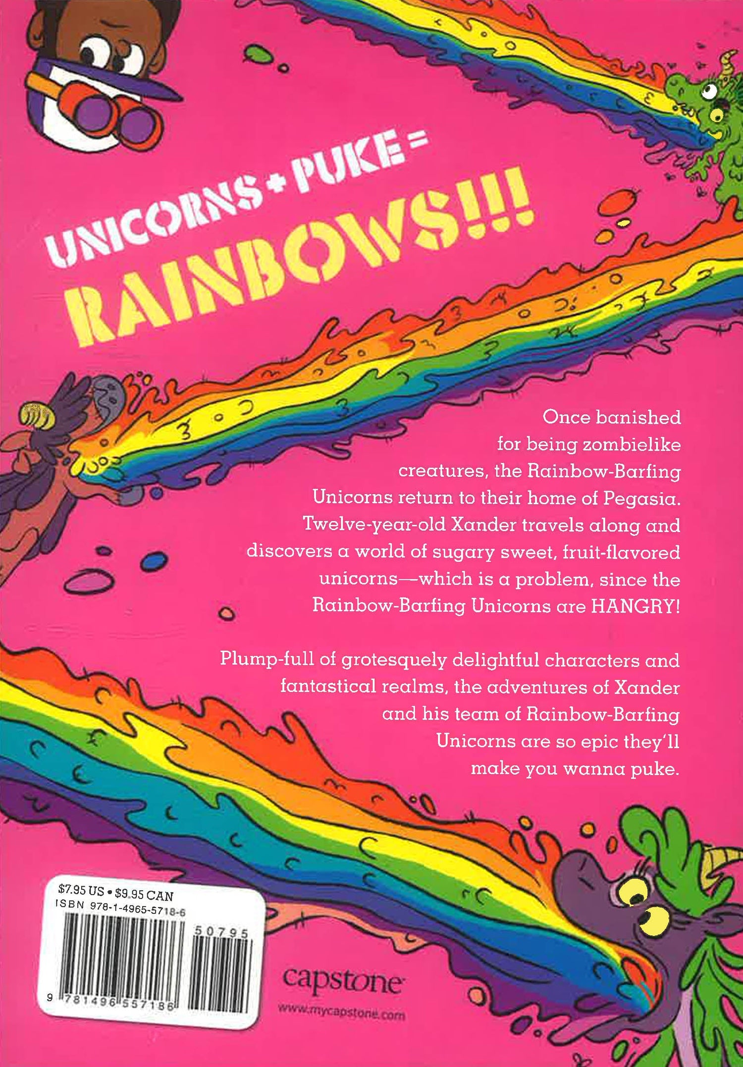 Xander Stone travels to the home world of the Rainbow-Barfing Unicorns and it smells surprisingly good! Once banished for being stinky, zombielike, upchucking creatures, the Rainbow-Barfing Unicorns (still stinky, zombielike, upchucking creatures) return to their home world, Pegasia. Twelve-year-old Xander travels along, but Pegasia isn't the retched realm he expects. Instead, beautiful, brightly colored, tra-la-la-ing unicorns roam this fairy tale-ish world. Heck, even their farts smell strawberry-sweet! Which is a problem, since the Rainbow-Barfers just emptied their stomachs and are craving fruit-flavored unicorns!